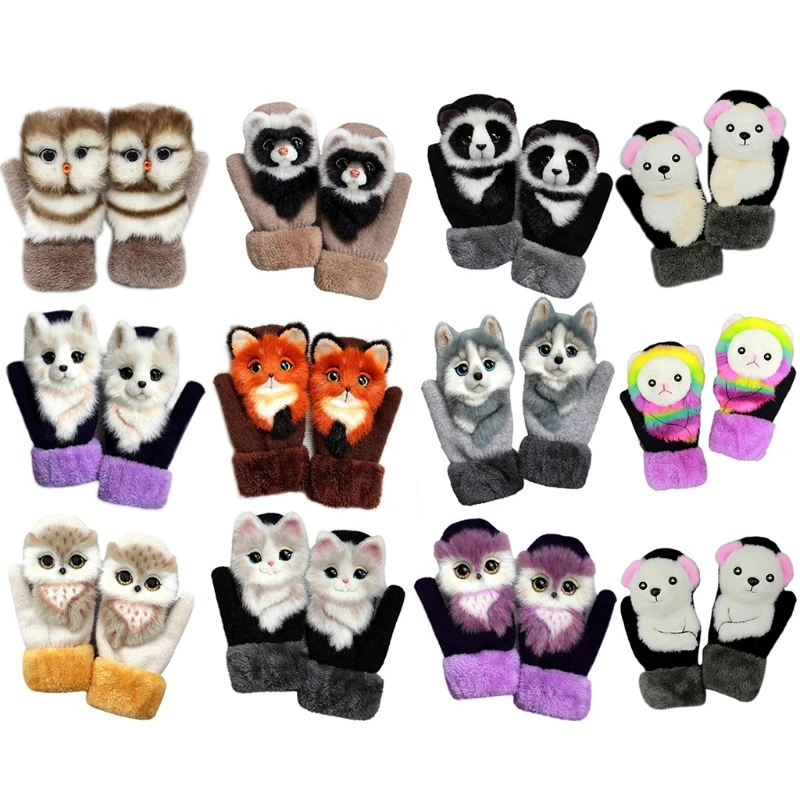 Женские и мужские зимние трикотажные перчатки милые 3D Пушистые Мультфильм животных Декор утепленные плюшевой подкладкой ветрозащитная Термальность теплые варежки