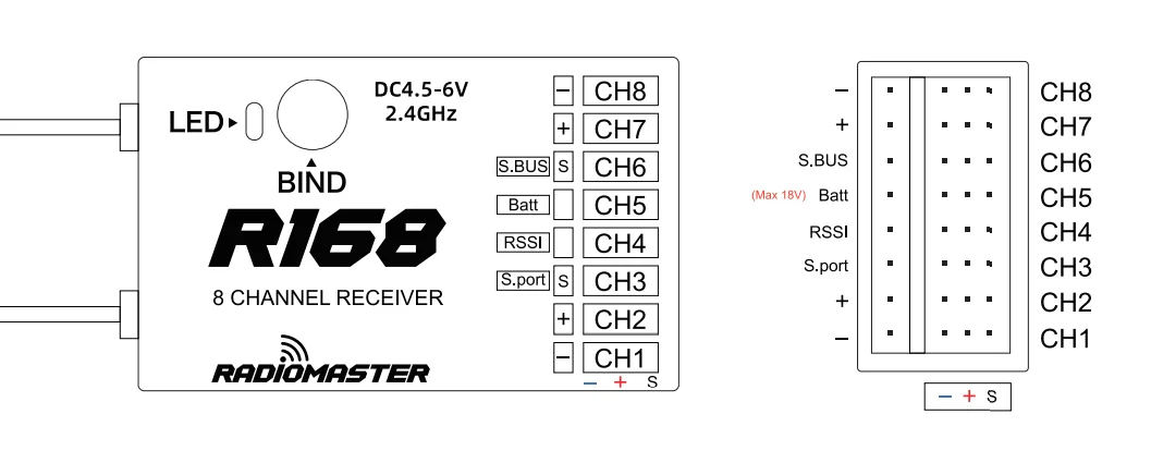 Телеметрия: S.port, RSSI output, VBAT (Обнаружение напряжения до 18 в)