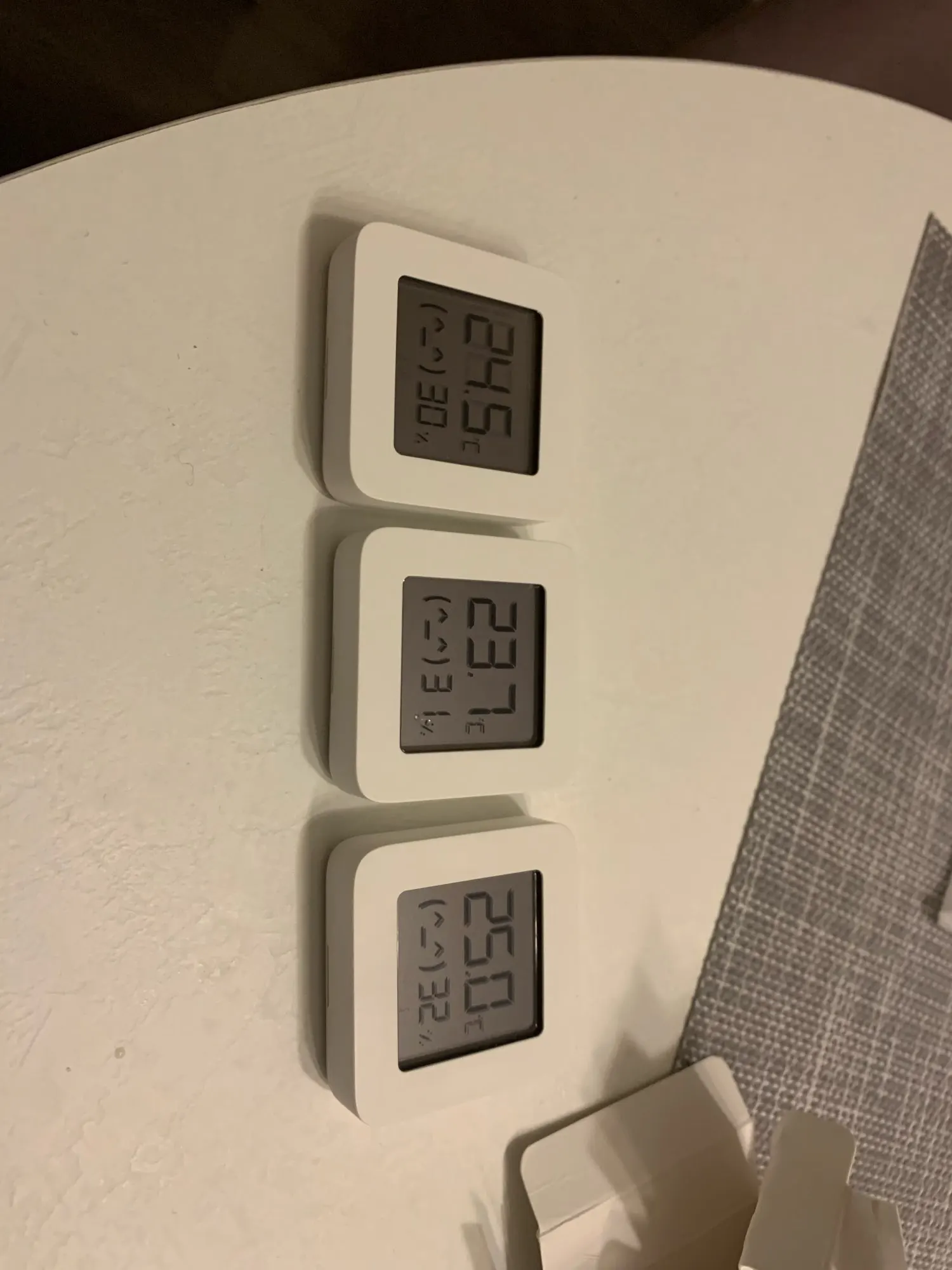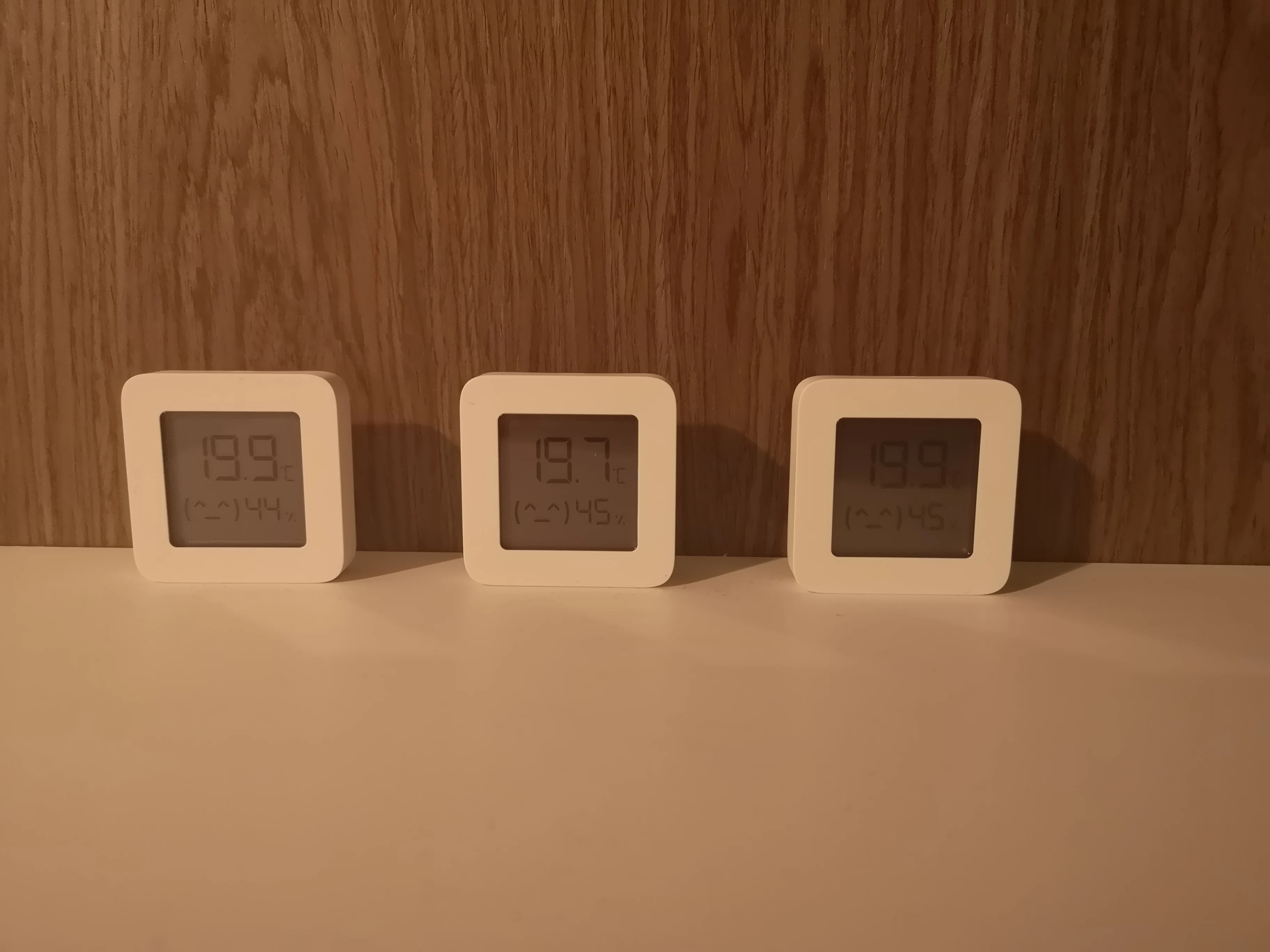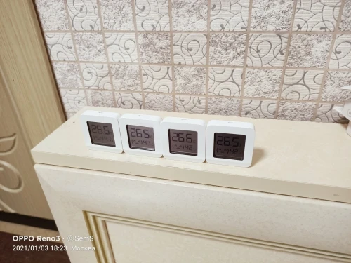Получил три датчика. Два показывают идентичную устоявшуюся температуру. А третий на 0,2C выше. Влажность одинаково показывают. По BlueTooth датчики подключил в приложении Mi Home.