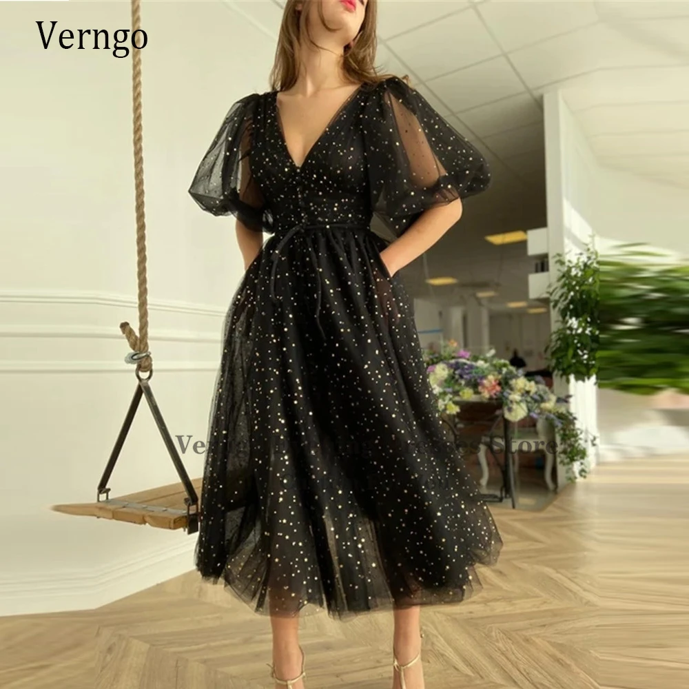 Verngo 2021 черное Тюлевое с золотыми и серебряными звездами короткое вечернее платье с пуговицами топ с пышными рукавами чай Длина выпускного вечера