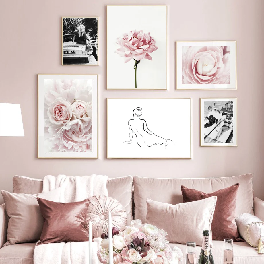 Постер с изображением розовых пионов, абстрактных линий, звезд, винтажный, скандинавский стиль, настенная живопись, декоративные картины для гостиной