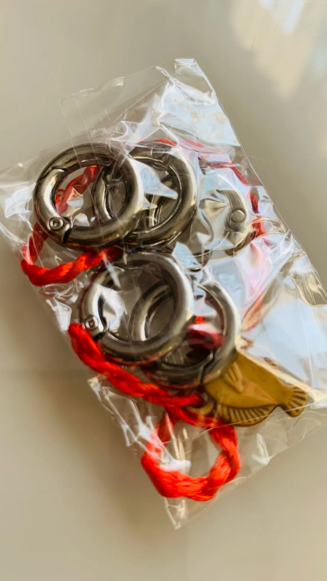 Доставка очень быстрая в сборной посылке. Карабины очень симпатичные, замочек рабочий, продавец положил в подарок браслетик. Не знаю, как покрытие будет в носке. Рекомендую.