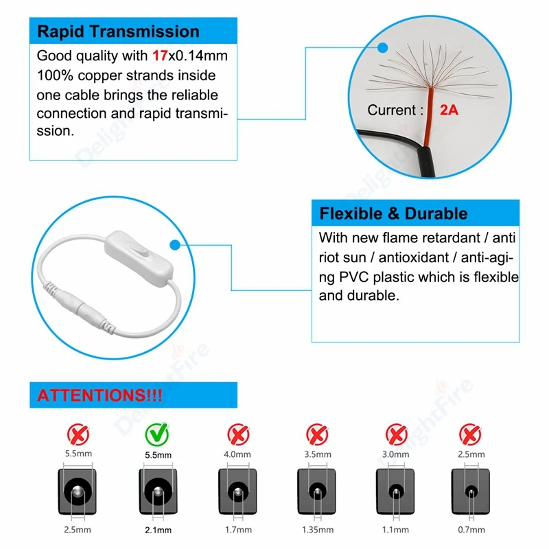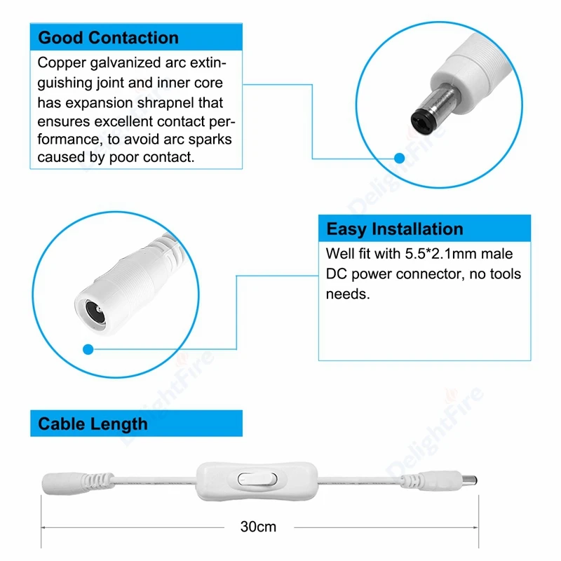 Встроенный переключатель светильник, кабель питания 5,5 мм x 2,1 мм, 12 В постоянного тока, разъем ВКЛ.ВЫКЛ., кабель адаптера питания для камеры видеонаблюдения, Светодиодная лента, лампа