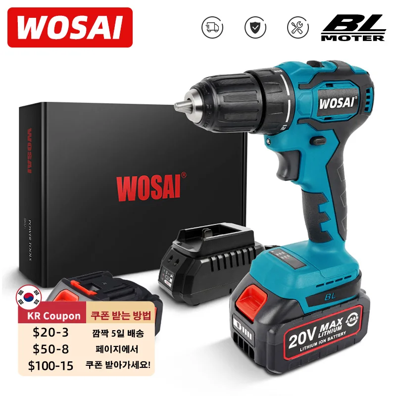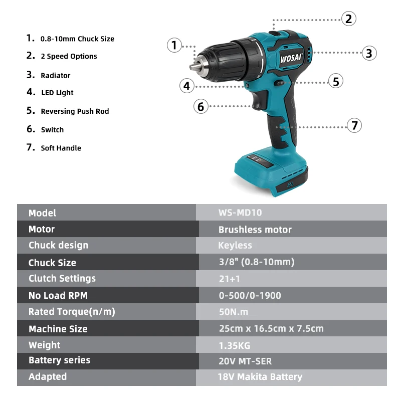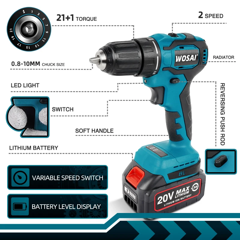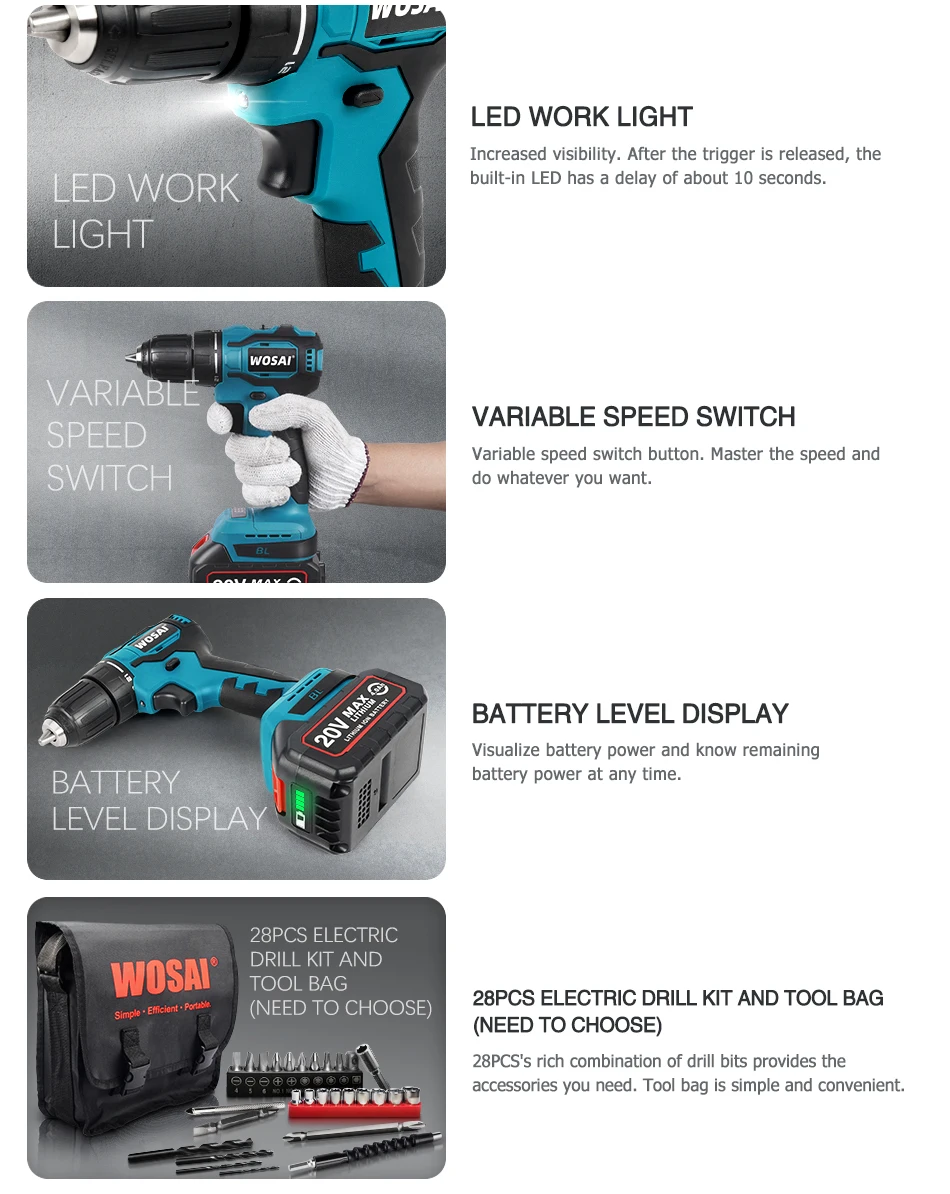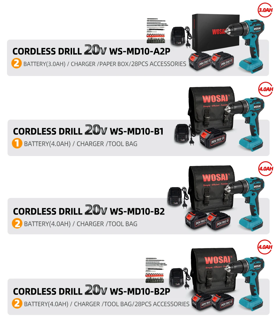 Дрель-шуруповерт WOSAI MT-Series, 20 В, 50 нм, на аккумуляторе 4,0 А ч