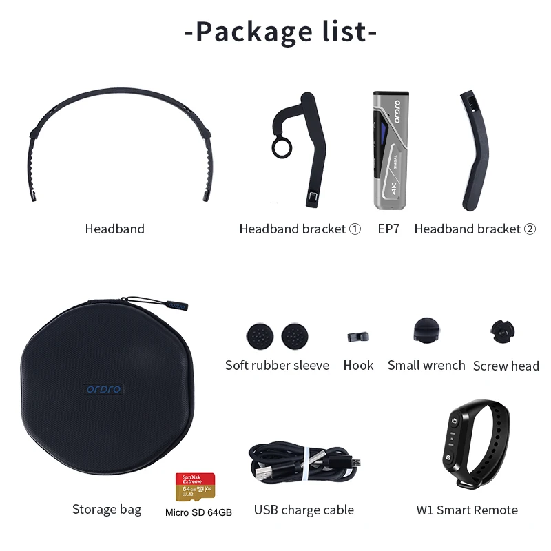 1 * EP7 FPV камера1 * W1 пульт дистанционного управления1 * USB кабель зарядного устройства1 * U3 64 Гб micro SD карта1 * повязка на голову1 * маленький ключ1 * винтовая головка2 * Мягкий Резиновый рукав1 * крючок1 * Руководство пользователя (Поддержка языков: английский; Русский; Китайский)1 * сумка для хранения