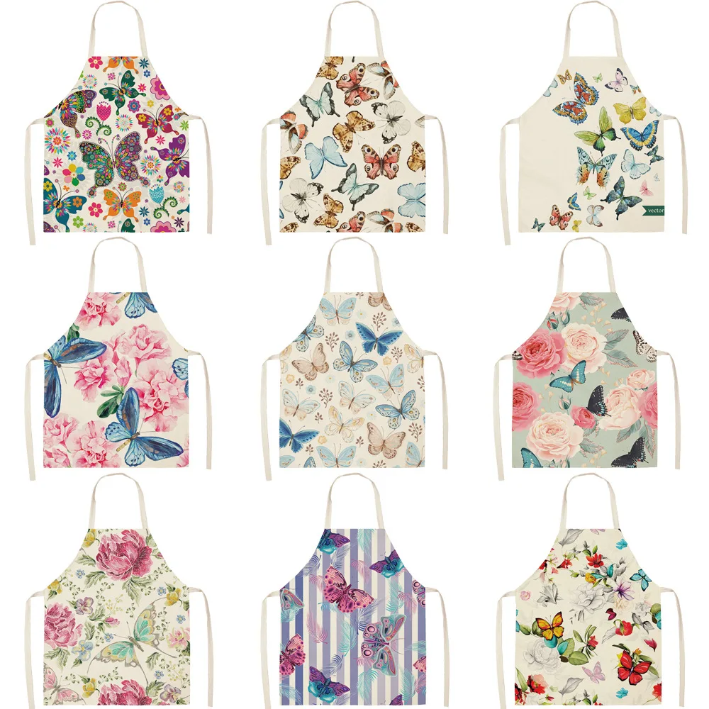Льняной Кухонный Фартук с бабочками и цветами для женщин, платье Kawaii, детские розовые садовые фартуки, аксессуары для приготовления пищи, домашний декор