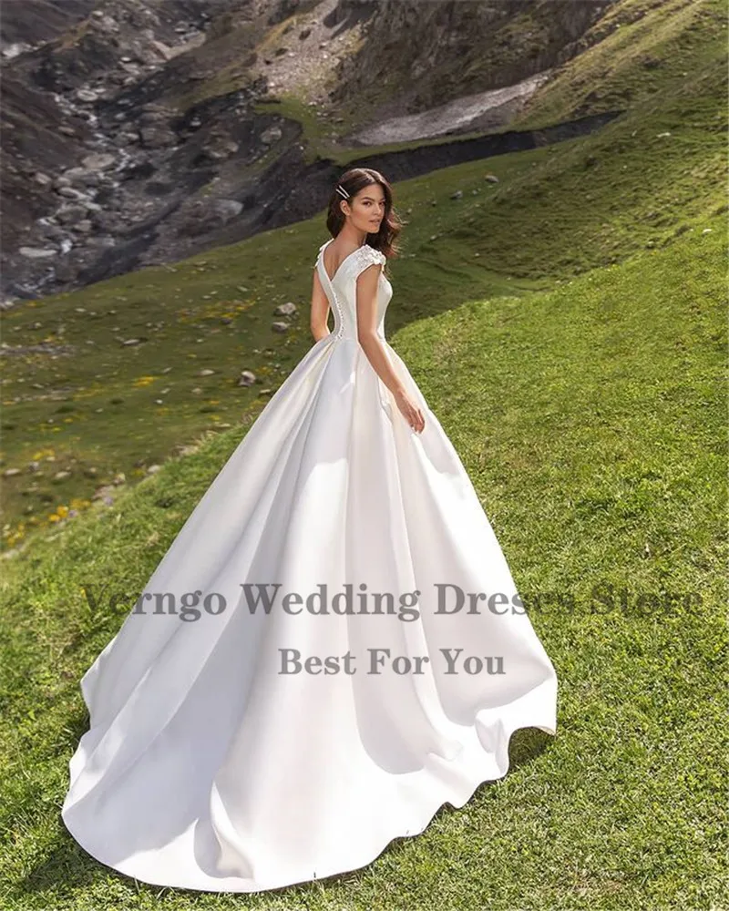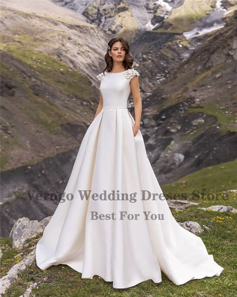 Простой Элегантный атласный свадебный наряд Verngo трапециевидной формы с карманами 3D цветами рукавами-крылышками винтажное платье 2021 свадебное платье на пуговицах сзади