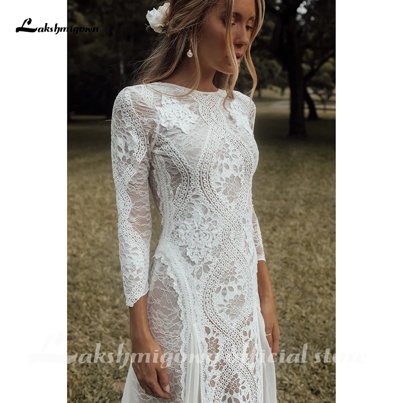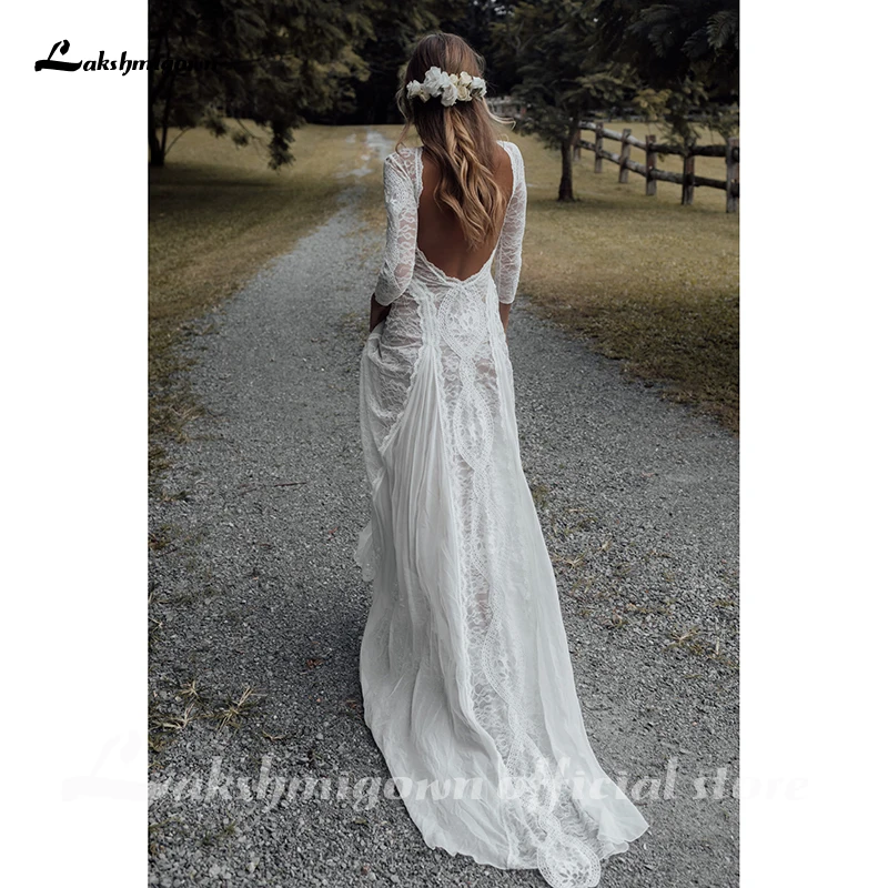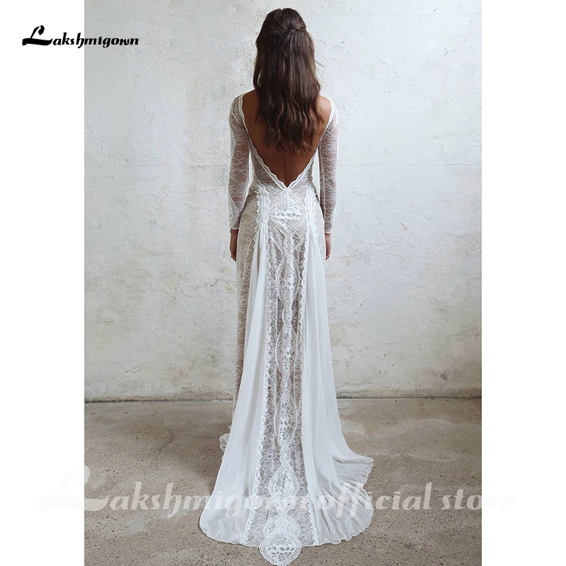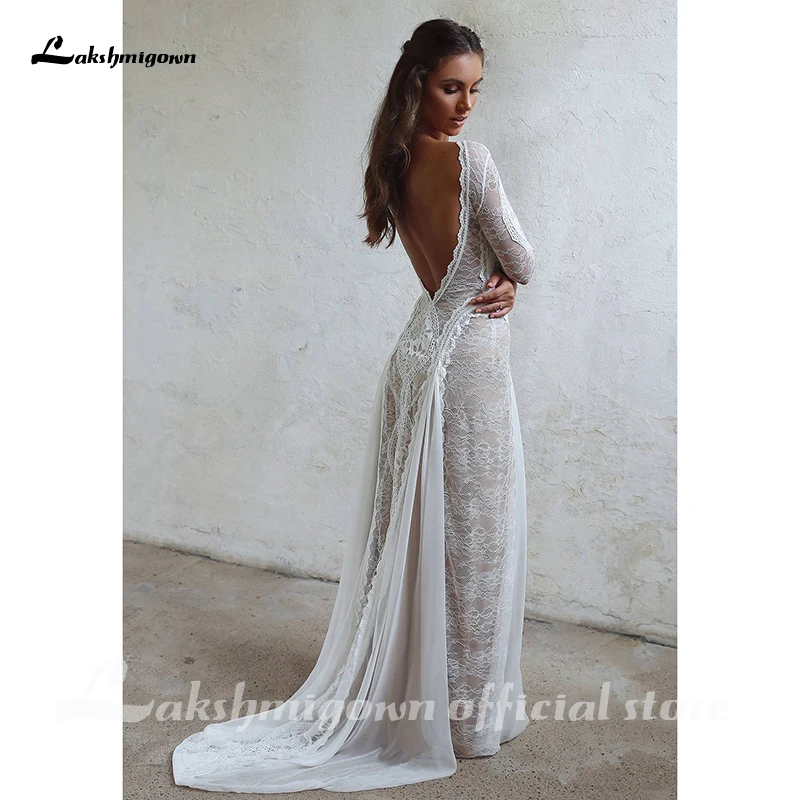 Кружевное свадебное платье Lakshmigown, ТРАПЕЦИЕВИДНОЕ ПЛАТЬЕ С Длинным Рукавом и открытой спиной, с глубоким вырезом, в стиле бохо, свадебное бохо-платье