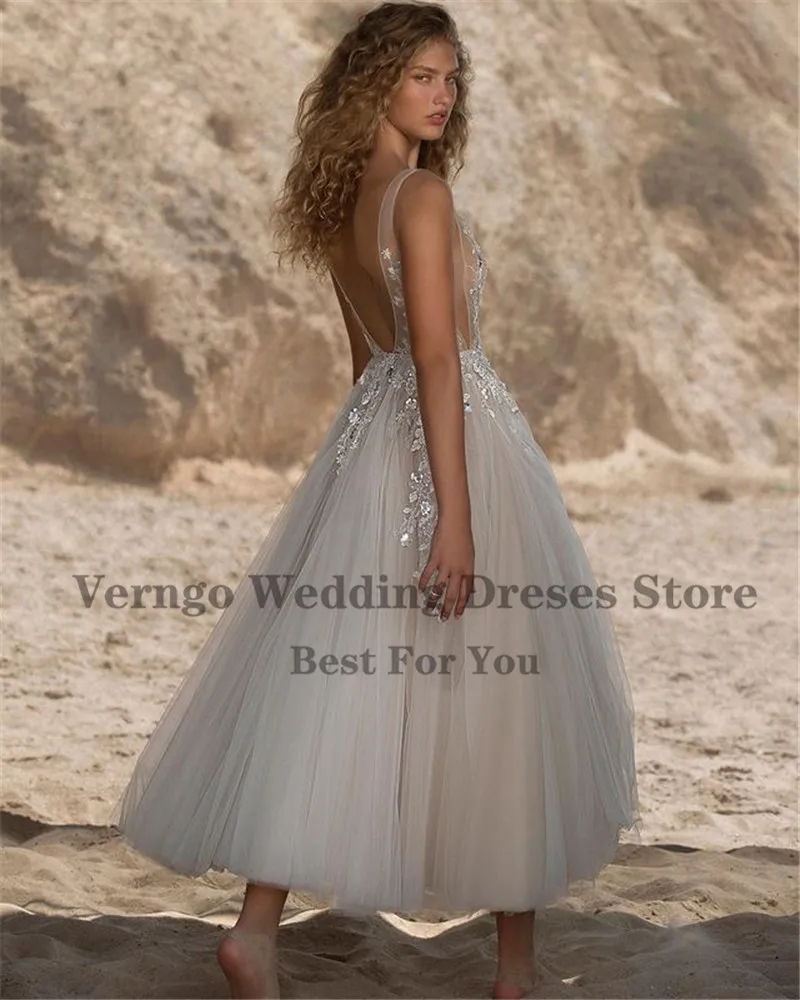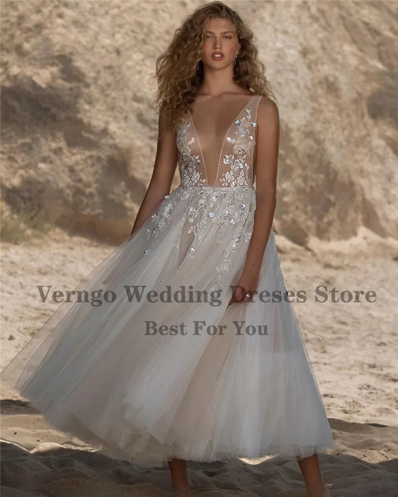 Пикантное Тюлевое Короткое свадебное платье Verngo с глубоким V-образным вырезом и нежными объемными цветами, пышная юбка длиной ниже колена, свадебные платья 2021