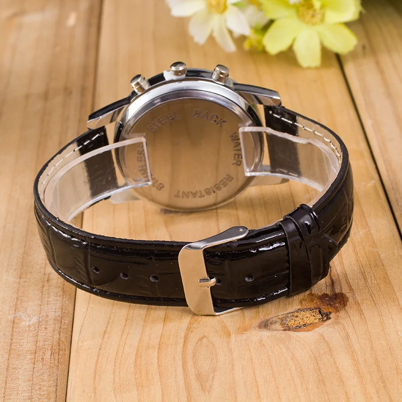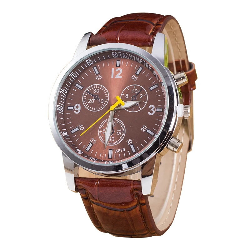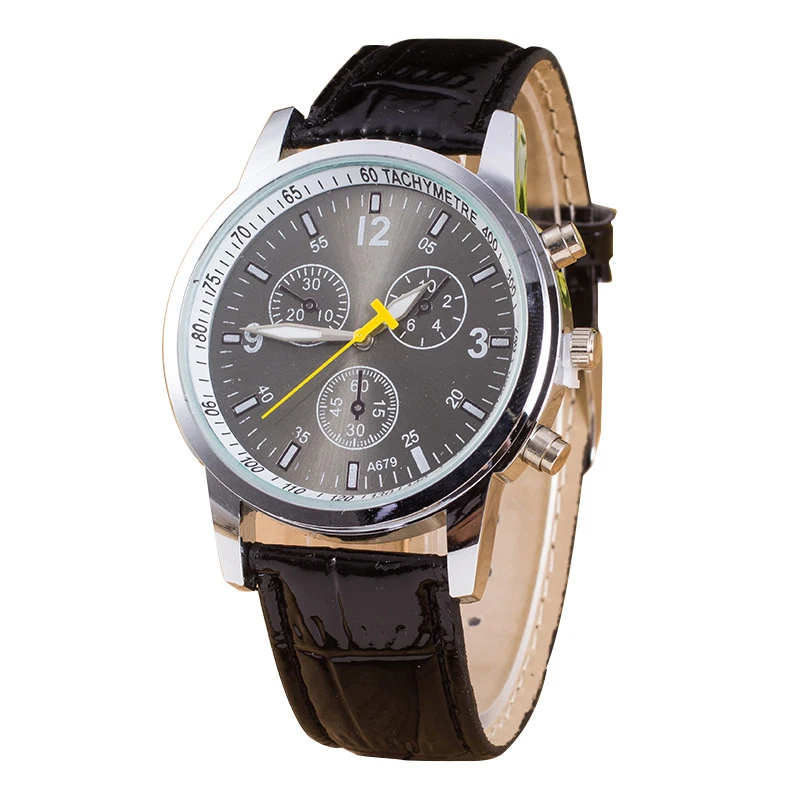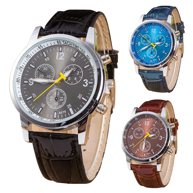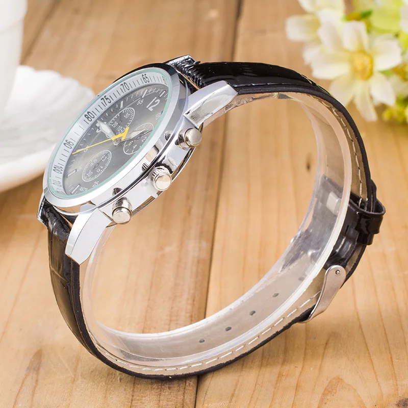 Часы с кожаным ремешком, кварцевые наручные часы с тремя глазами и стеклянным циферблатом, мужские часы