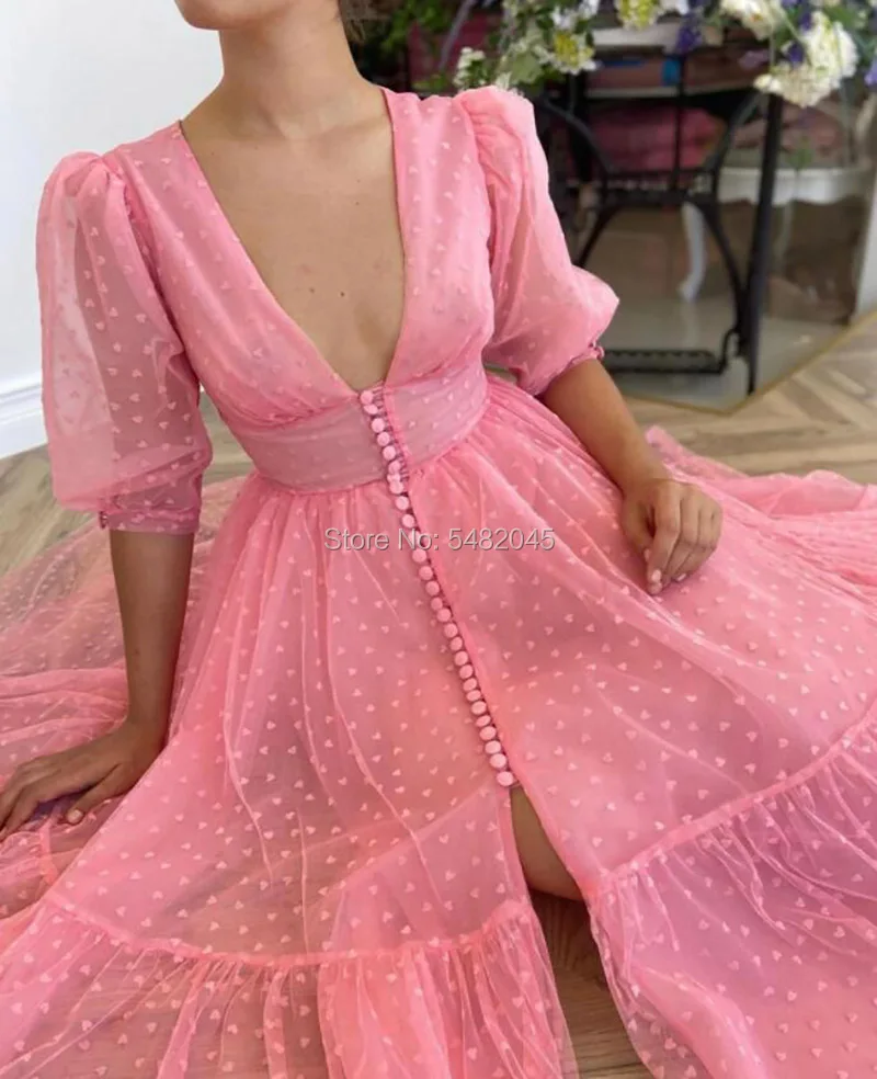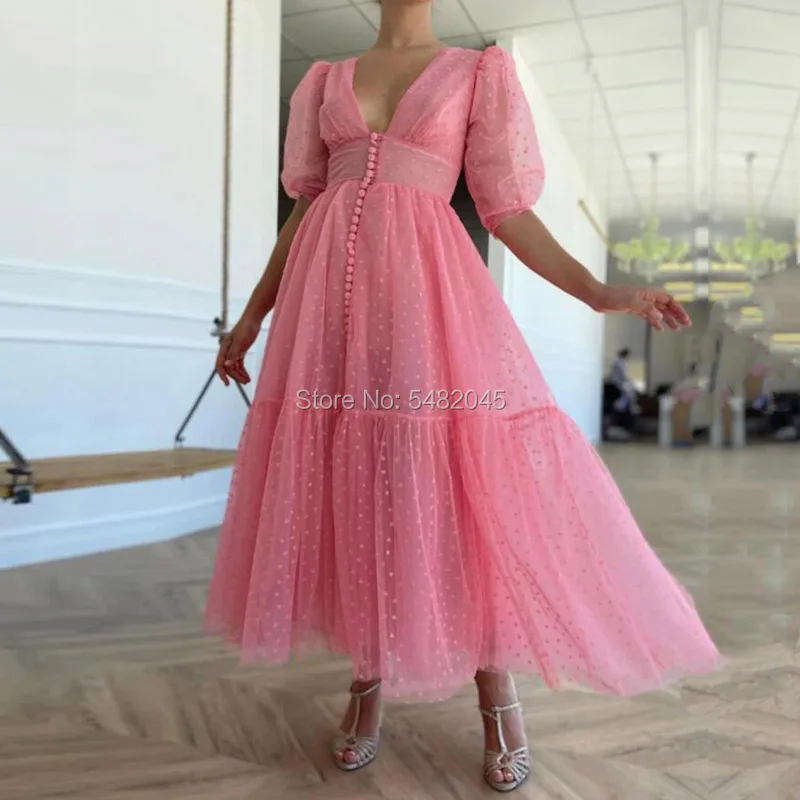 Лори Винтаж Выпускные платья с v-образным вырезом Рубашка с короткими рукавами трапециевидной формы Тюль Чай Длина вечерние платья в богемном стиле 1950 Рождество Robes de коктейльное