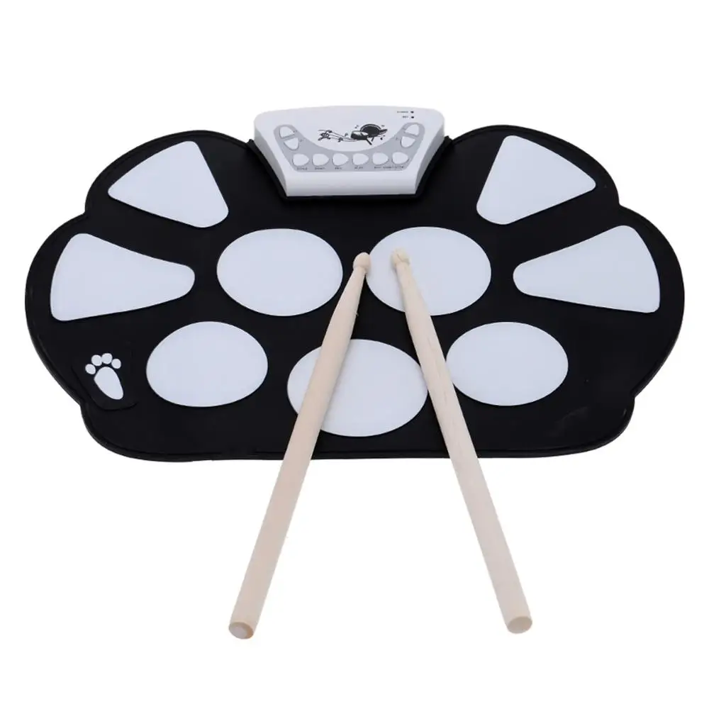 Характеристики:Цвет: черный + белыйМатериал: силикон + пластикТона барабанной установки: поп, рок, латина, электро, перкуссияДемо-песни: Heavy Rock, Funk, латинские, танцевальные, Самба, ча-ча, качели Hi-Hat, Upbeat RockПитание: USB-кабель (входит в комплект) или 2 * батарейки типа "ААА" (не входит в комплект)Размер товара: 43*28*2,7 см/16,9*11 * 1.1inВес изделия: 455 г/16 унцийПосылка: 48*33*5 см/18,9*13*2 дюймаВес посылка: 1110 г