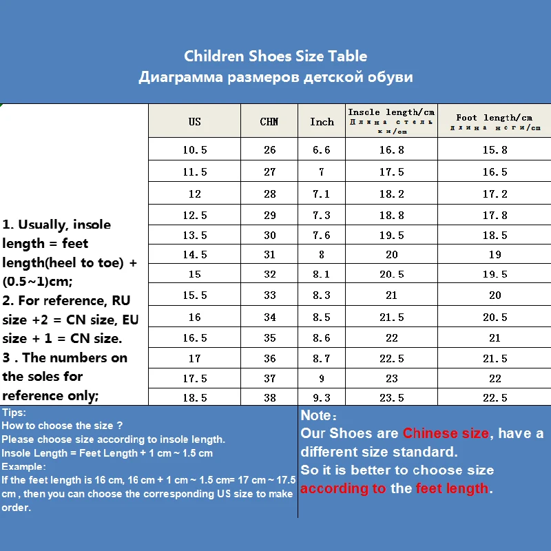 2. Поскольку разные ботинки имеют разный размер, при выборе размера для детей необходимо учитывать длину стопы ребенка. Если у вас есть какие-либо вопросы, пожалуйста, свяжитесь с нами!