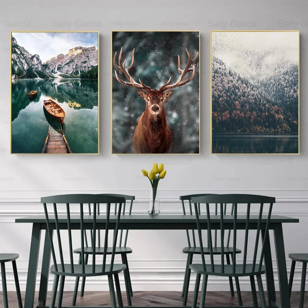Постер горного пейзажа, лодка, лес, олень, зеленые растения, художественные обои, река, холст, живопись, печать, ремесла для домашнего декора