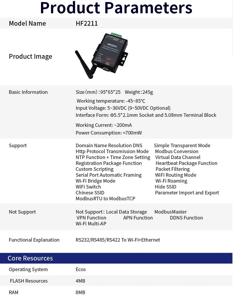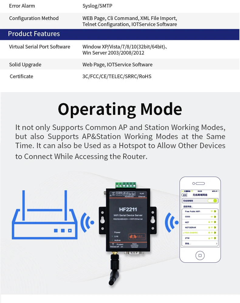 Последовательный преобразователь HF2211 RS232 RS485 RS422 в Wi-Fi E...
