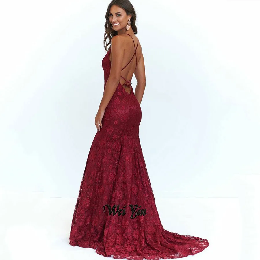 Weiyin AE0551 элегантное вечернее платье с V-образным вырезом бордового цвета с юбкой-годе платья для вечеринок Длинные кружевные платья для выпускного вечера