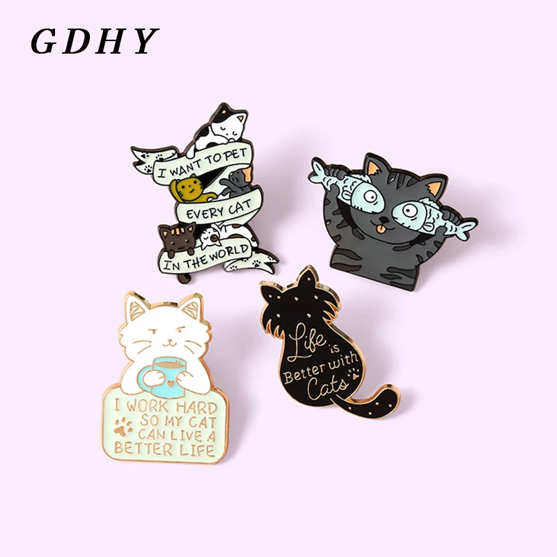 GDHY эмалевые булавки в виде кошки и рыбы и баннера в виде кошки Я хочу разгладить каждого кошки в мире кошки значок брошь на заказ лацкан животные ювелирные изделия