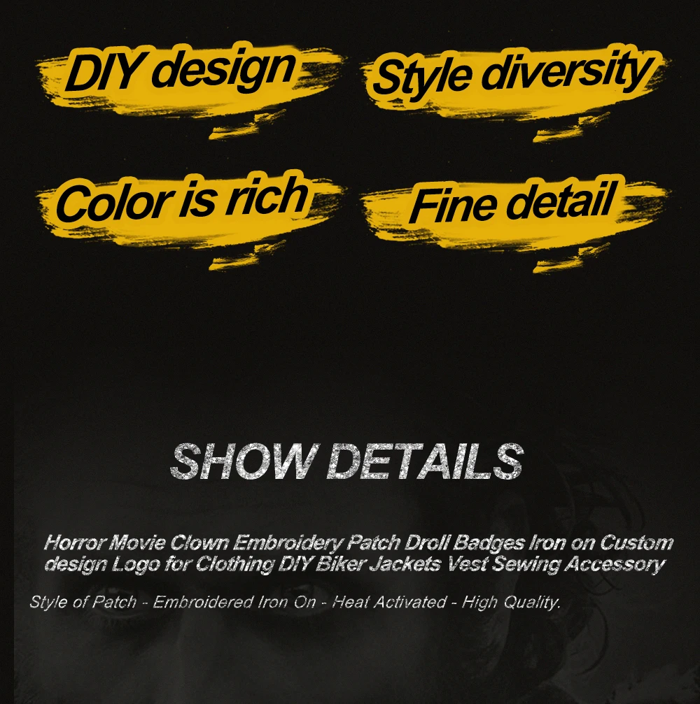 Размер: около 8*5,3 см Цвет: как на фото Стиль: приклеить/пришить Название продукта: патч с вышивкой клоуна из фильма ужасов Посылка ходит: патч 10 шт. Белая саржевая ткань с утюгом на подложке и 100% наб