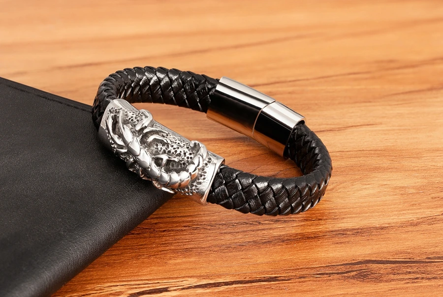 Мужской кожаный браслет с магнитной пряжкой, черный кожаный браслет из нержавеющей стали в роскошном стиле с животным дизайном, подарок на Рождество