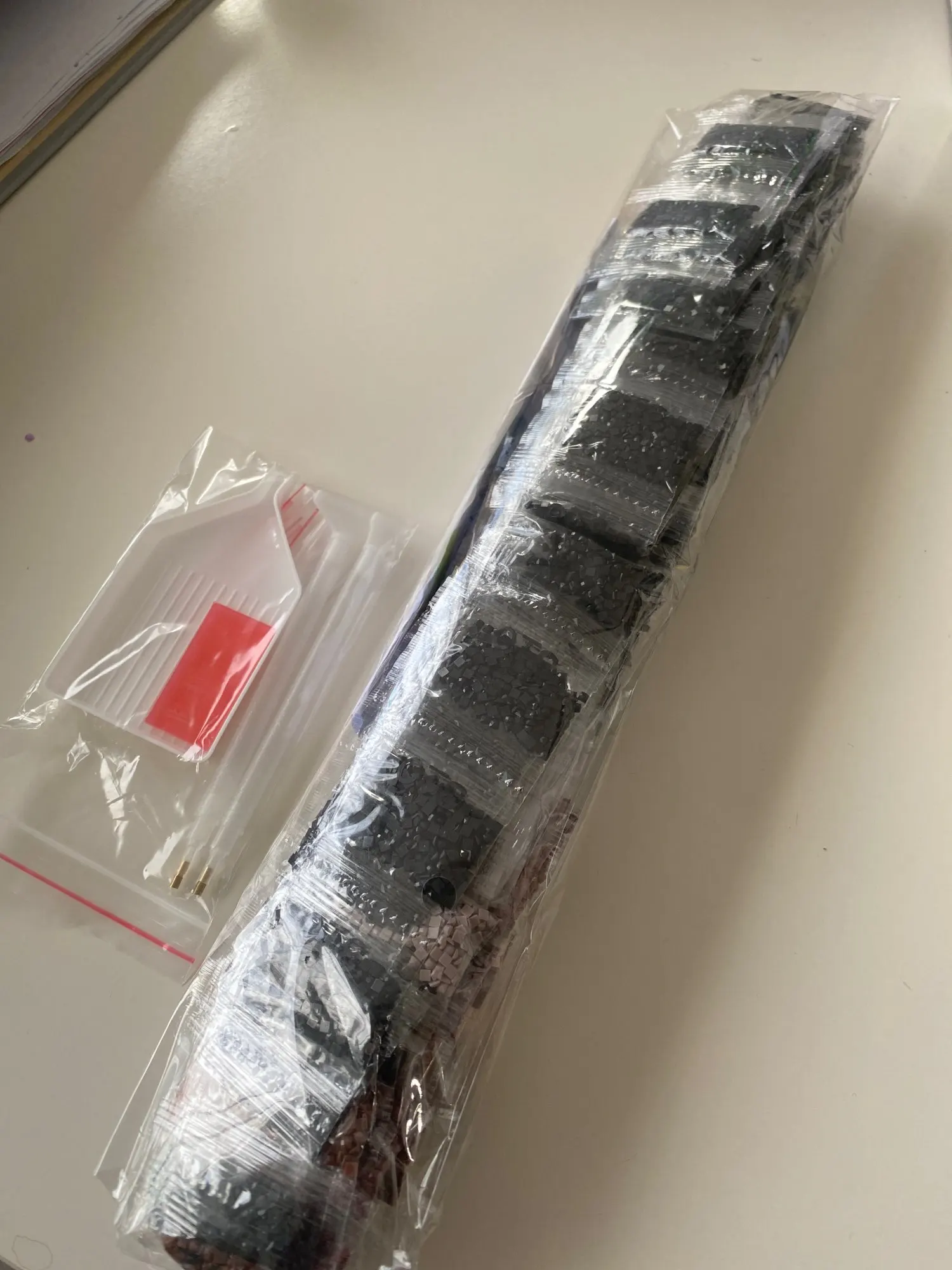 Я быстро получил посылку. Но он сложен, поэтому он не будет лежать на плоской подошве. Я думаю, что алмазы не прилипают. Но я попробую