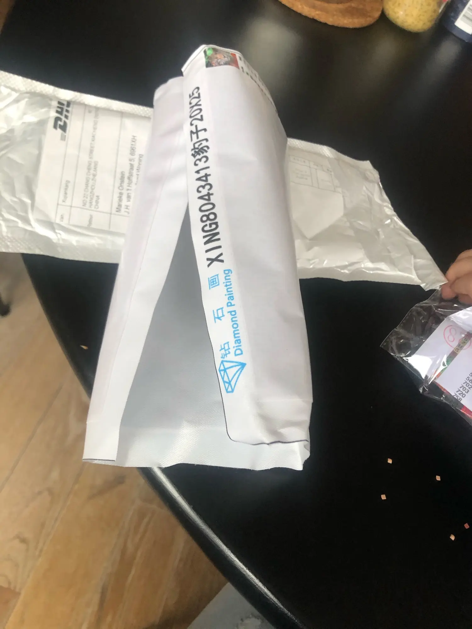 пришла за три недели, свёрнута в рулон, без валика, в аэропакете, алмазики в целофанках, простой инструмент, не помялась
