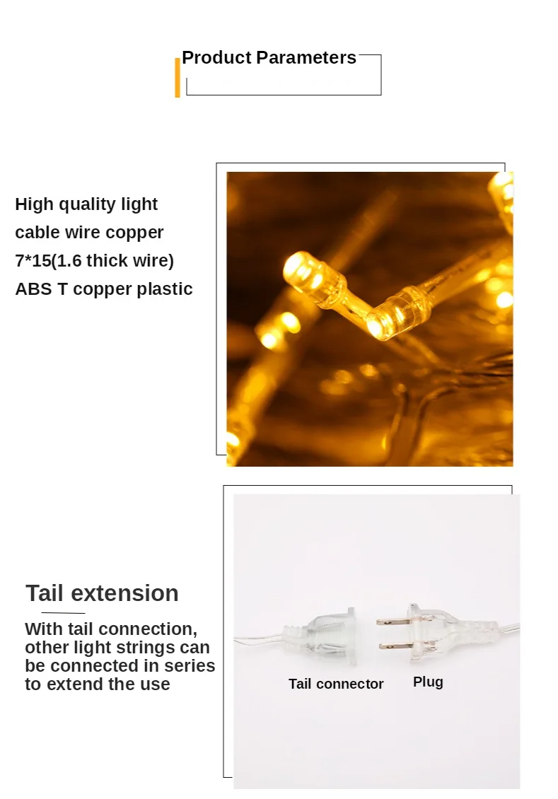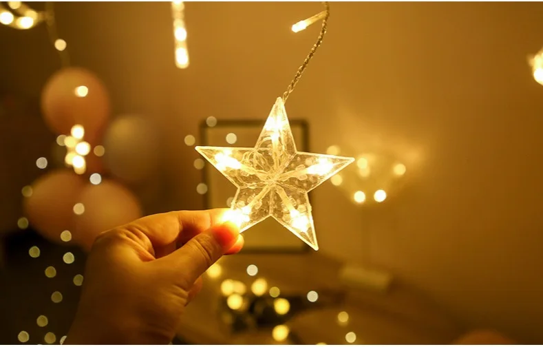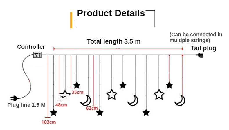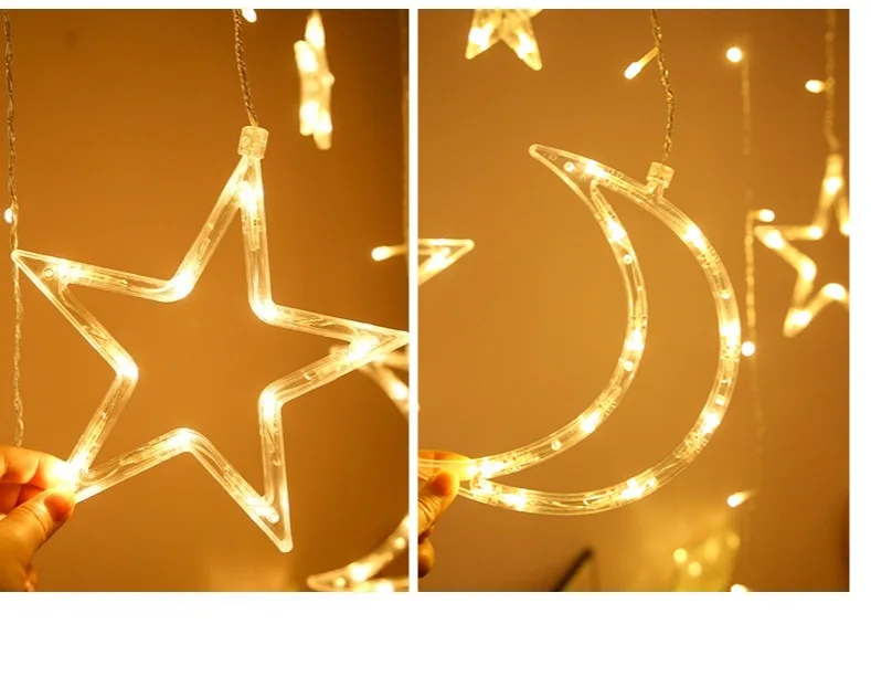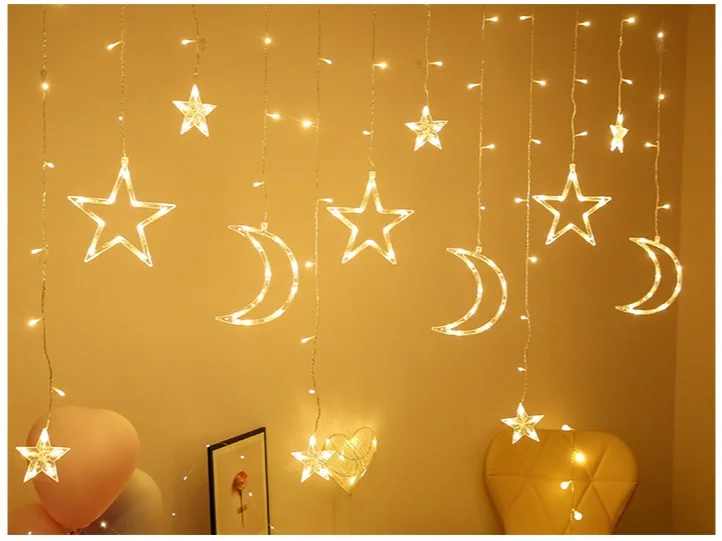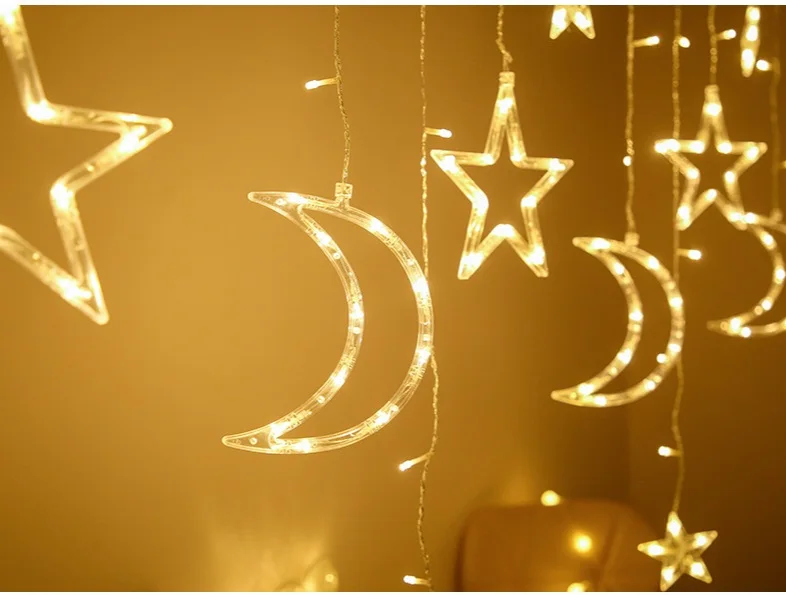 Название продукта: светодиодный светильник звезда и лунный занавес светильникЦвет: теплый белый, холодный белый, многоцветныйКоличество подвесок: 3 большие звезды, 3 луны, 6 маленьких звездНапряжение: 220 В переменного токаСтандарт штепсельной вилки: штепсельная вилка европейского стандарта/штепсельная вилка американского стандартаВодонепроницаемость: IP44Материал: медная проволока + пластиковая крышкаДлина: 3,5 мСвинцовый провод (линия): 1,5 м8 режимов • Питание: 1. Постоянный светильник режим 2. Режим вспышки 3. Мигающий режим 4. Непрерывный режим 5. Режим волны 6. Fantasy 7. Свое существование режим 8. Медленный режим вспышки