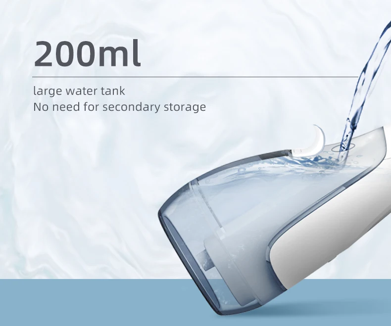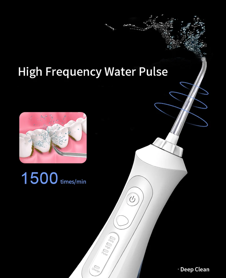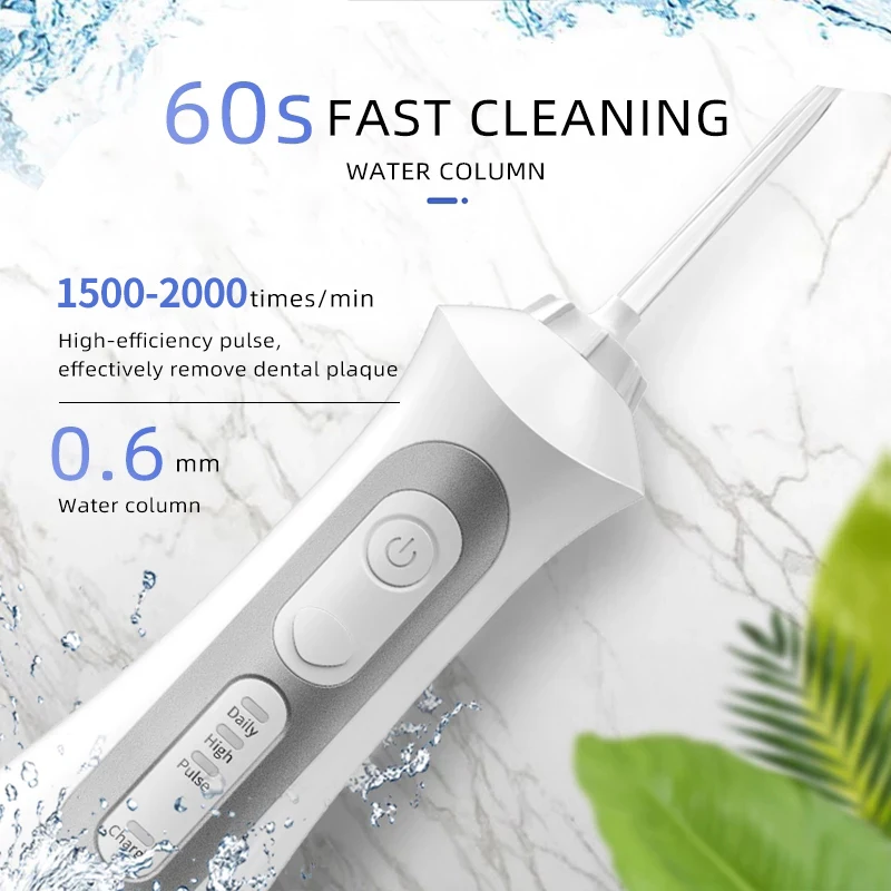 Характеристика продукта:3 режима (ежедневно, высоко, пульс) подходит для различных условий зубов и десен (ежедневно для нежной очистки, высокая для глубокой очистки, пульс для чистого массажа)Портативный резервуар для воды объемом 200 мл и компактный дизайн идеально подходят для путешествий, деловых поездок, дома, офиса и подарка. Вы можете взять его в любое место, куда захотите.Вращающаяся на 360 ° конструкция сопла позволяет легко очистить внутреннюю сторону, где трудно достичь, и предотвращает образование мусора и зубного налета.5 часов быстрой зарядки USB длится более 30 дней. Зарядный светильник красного цвета для напоминания о низком заряде батареиВодонепроницаемый IPX7 можно использовать для душа в ванной комнате, его можно стирать в чистке.