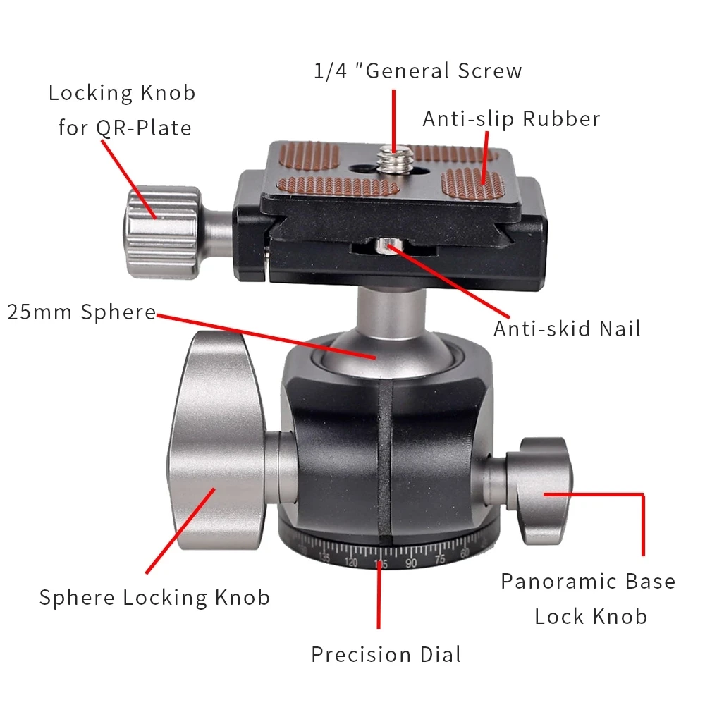 Бренд: XILETU Модель: XG-25 Материал: алюминиевый сплав диаметр сферы: 25 мм диаметр дна: 38 мм Вес: 192 г Грузоподъемность: 6 кг Высота: 60 мм БЫСТРОРАЗЪЕМНАЯ пластина: нижнее отверстие под винт 38x40 мм (ARCA швейцарская тарелка): 3/8 ″