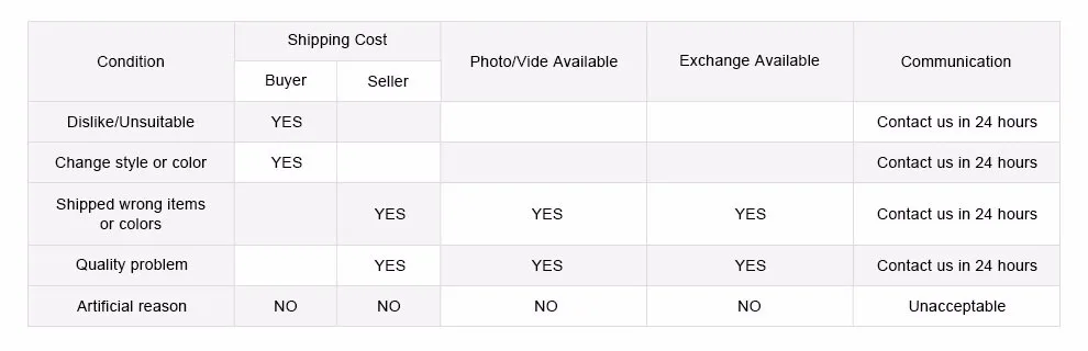 4. Вот еще 2 советы для вас: покупатель будет нести ответственность за стоимость доставки, чтобы вернуть товары. И, пожалуйста, свяжитесь с нами в течение 24 часов после получения товаров.