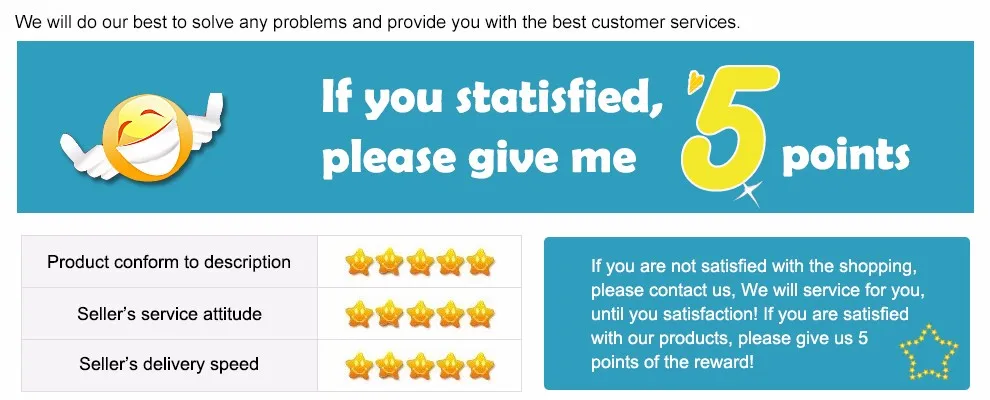 1. Ваше удовлетворение и положительные отзывы очень важны для нас. Если вы удовлетворены нашими товарами и услугами, пожалуйста, дайте нам положительный отзывы и 5 звезд. Мы с радостью предоставим вам купон в размере 3 долл. США для вашего следующего заказа в качестве любезности клиента.