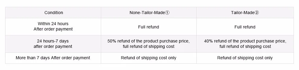 Как вы уже отмечали, на станции ACGN мы предлагаем индивидуальное и не индивидуальное обслуживание некоторых товаров. Пожалуйста, обратите внимание на приведенную ниже таблицу для политики отмены заказа: