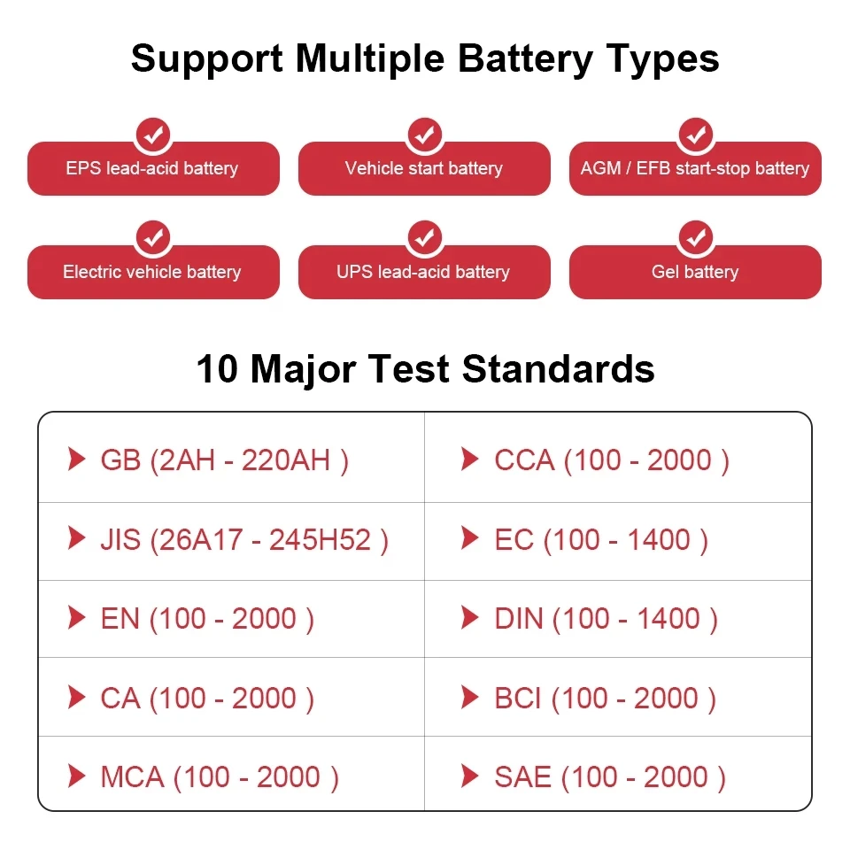 Такие как регулярные Затопленные, AGM плоские пластины, AGM спираль, гель и батареи глубокого цикла. Совместим с автомобилями, мотоциклами, грузовыми автомобилями, квадроциклами, внедорожниками, лодками, лодками, косилками и даже тележками для гольфа. Результаты тестирования основаны на стандартах CCA, EN, CA, MCA, DIN, SAE, JIS и IECДоступно несколько языков:Английский французский русский немецкий итальянский японский Испанский Португальский польский китайский