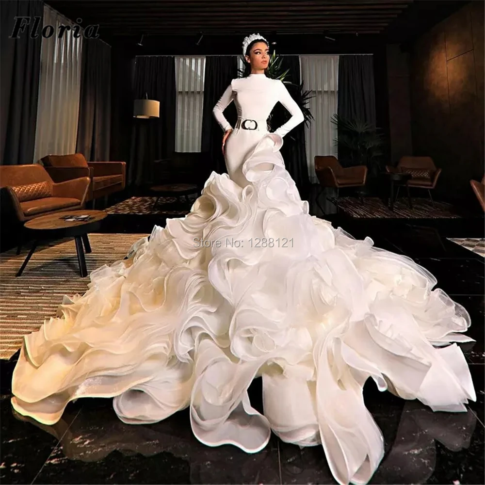 Роскошные свадебные платья со шлейфом в стиле часовни, с высоким воротником и длинным рукавом, с оборками, в арабском стиле, Дубай, 2021 Свадебная юбка, платье для невесты