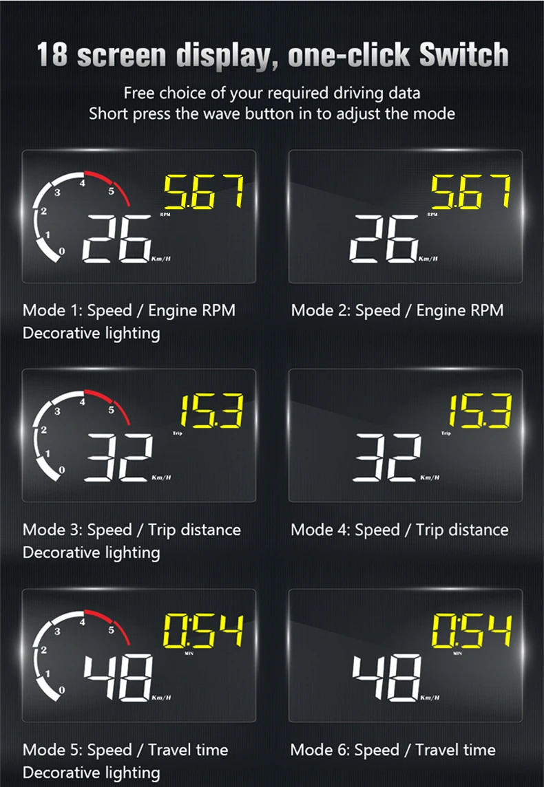 -Богатый дисплей данных: скорость/напряжение/Температура воды/расстояние поездки/Время в пути/часы/обороты двигателя/мгновенный расход топлива/100 км переключение ускорения, может обнаруживать и устранять ошибки автомобиля диагностический код без профессионального оборудования;