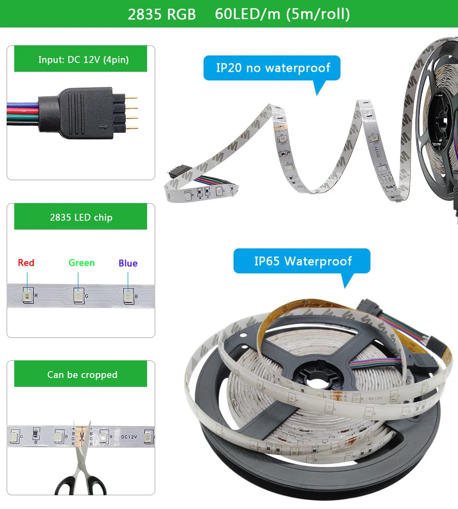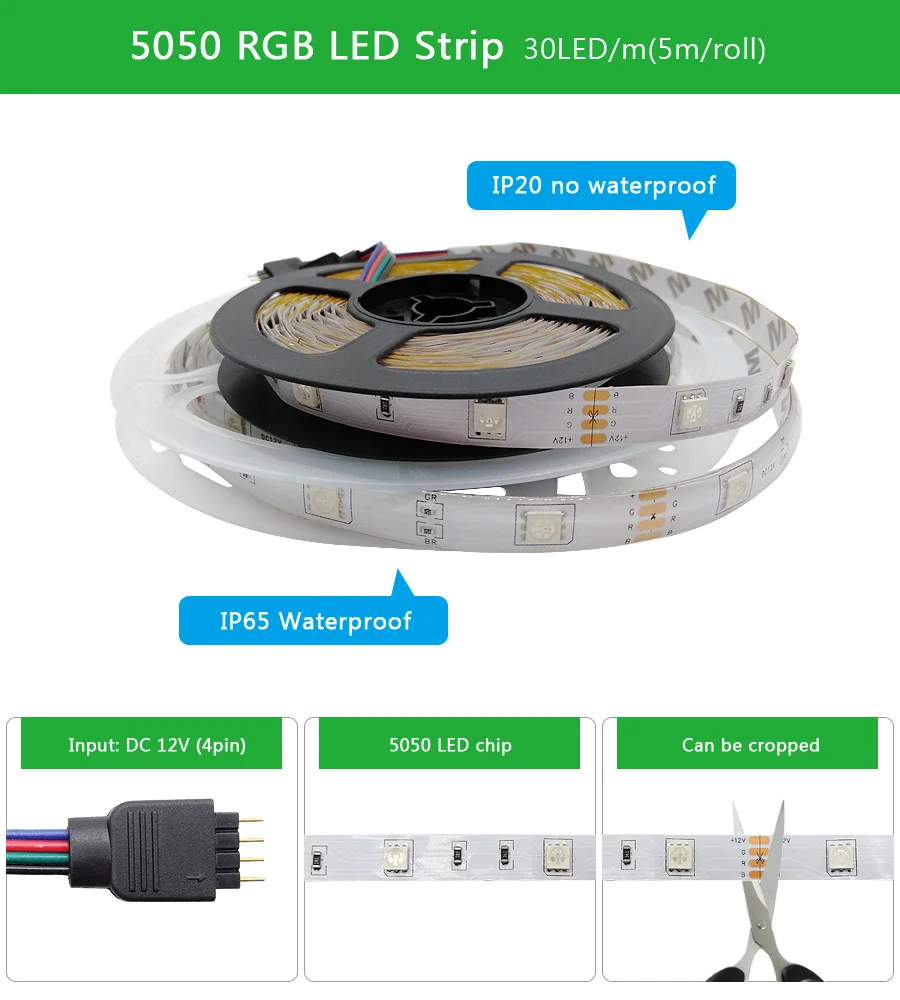 Светодиодные полосы RGB: 5 м = 1*5 м; 10 м = 1*10 м или 2*5 м; 15 м = 10 м + 5 м или 3*5 м; 20 м = 2*10 м или 4*5 м (выбирается случайным образом персоналом склада)