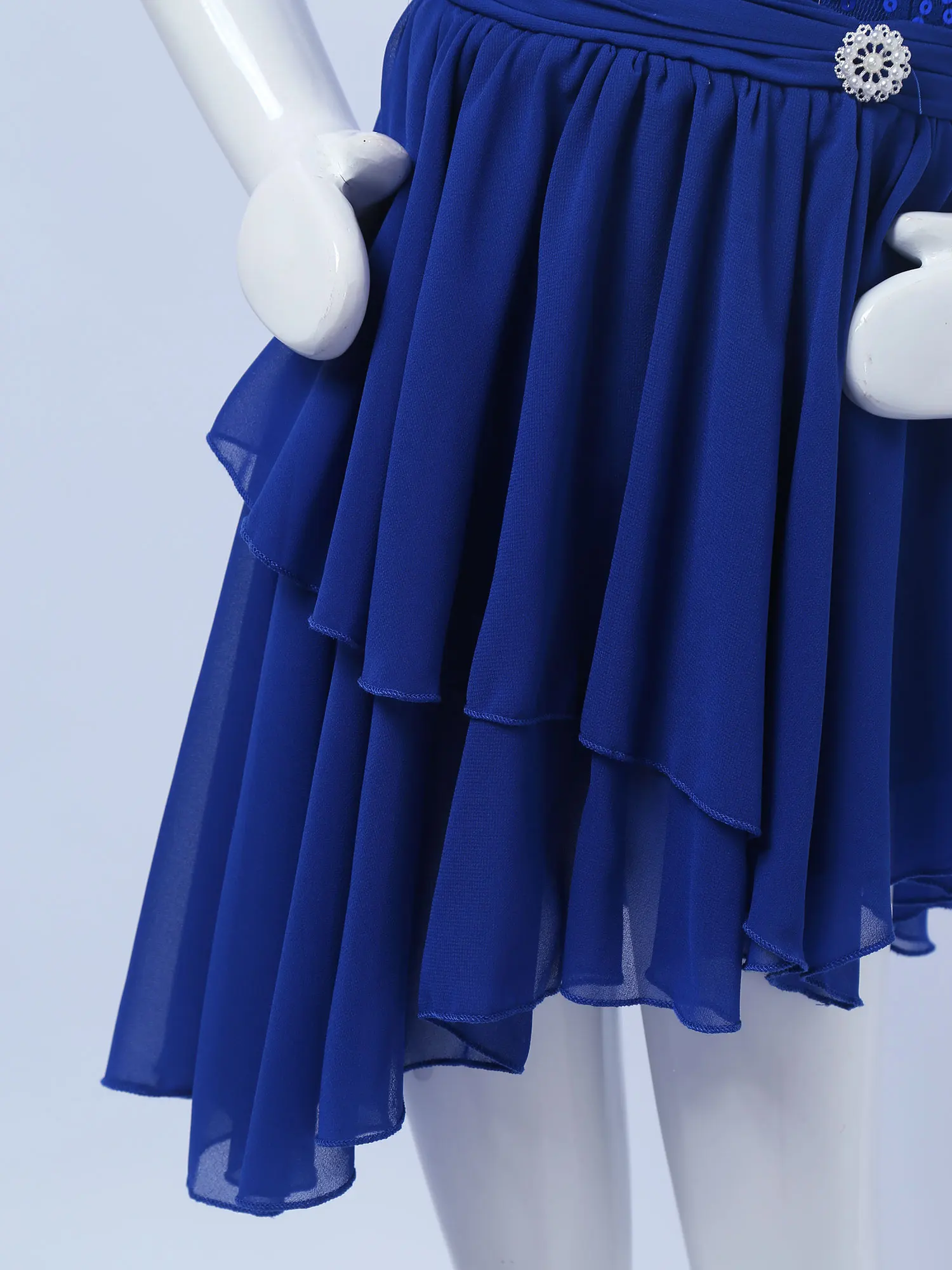 Танцевальное платье изготовлено из полиэстера, тюля и пайеток, ручная стирка. Таблица размеров означает возраст для девочек, но только для общего руководства. Без рукавов, с вырезом на шее и застежкой, скрытой бантом из ленты. Передняя Замочная скважина. В клетке сзади. Топ с лифом украшен блестящими блестками и прикрепленной юбкой-меху. 1 многослойная фатиновая юбка с асимметричным вырезом прикрепляется к талии. Сочетающиеся шорты со встроенной кнопкой. Хорошая эластичная ткань, удобная в носке. Красивая Одежда для танцев для вашей девочки. Подходит для похвалы танцев, празднования духа, выступления на сцене, современного танца и т. д.