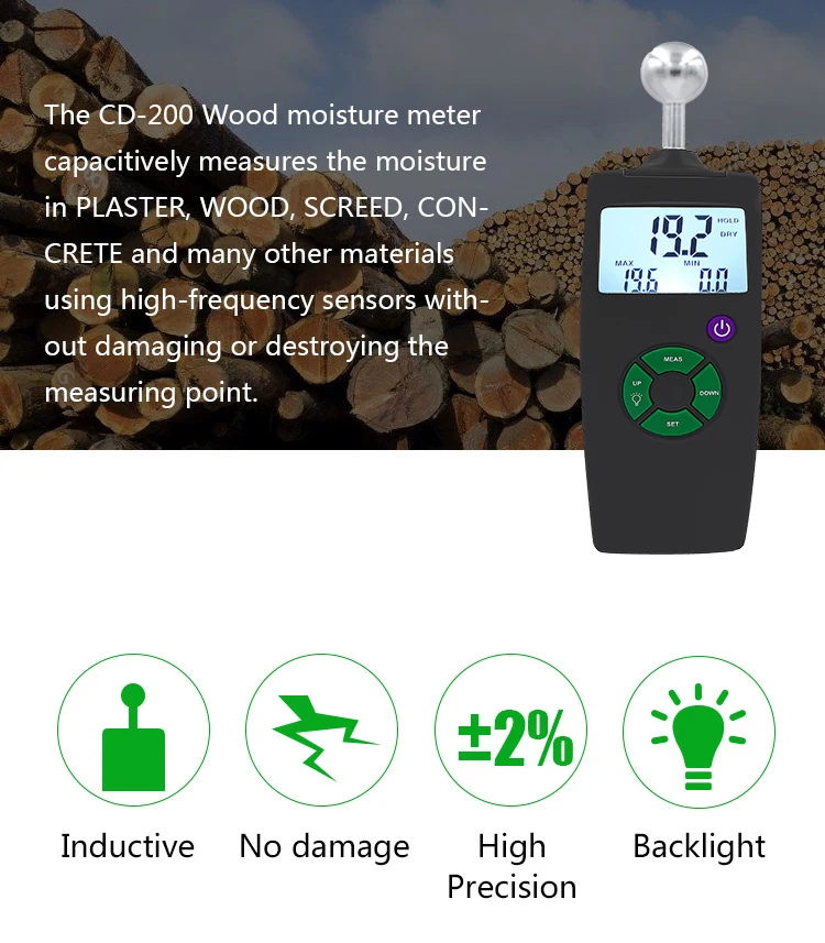 Бесконтактный датчик влажности контролирует влажность в древесине и других строительных материалах, не вызывая повреждения поверхности. Высокочастотная технология зондирования позволяет измерителю принимать неинвазивные измерения влажности. Программируемые сигналы тревоги оповещают пользователя, если измерения влажности превышают контрольные точки сигнализации. Его счетчик поставляется полностью протестирован и откалиброван и с правильным использованием, обеспечит долгие годы надежного обслуживания.Описание счетчика: