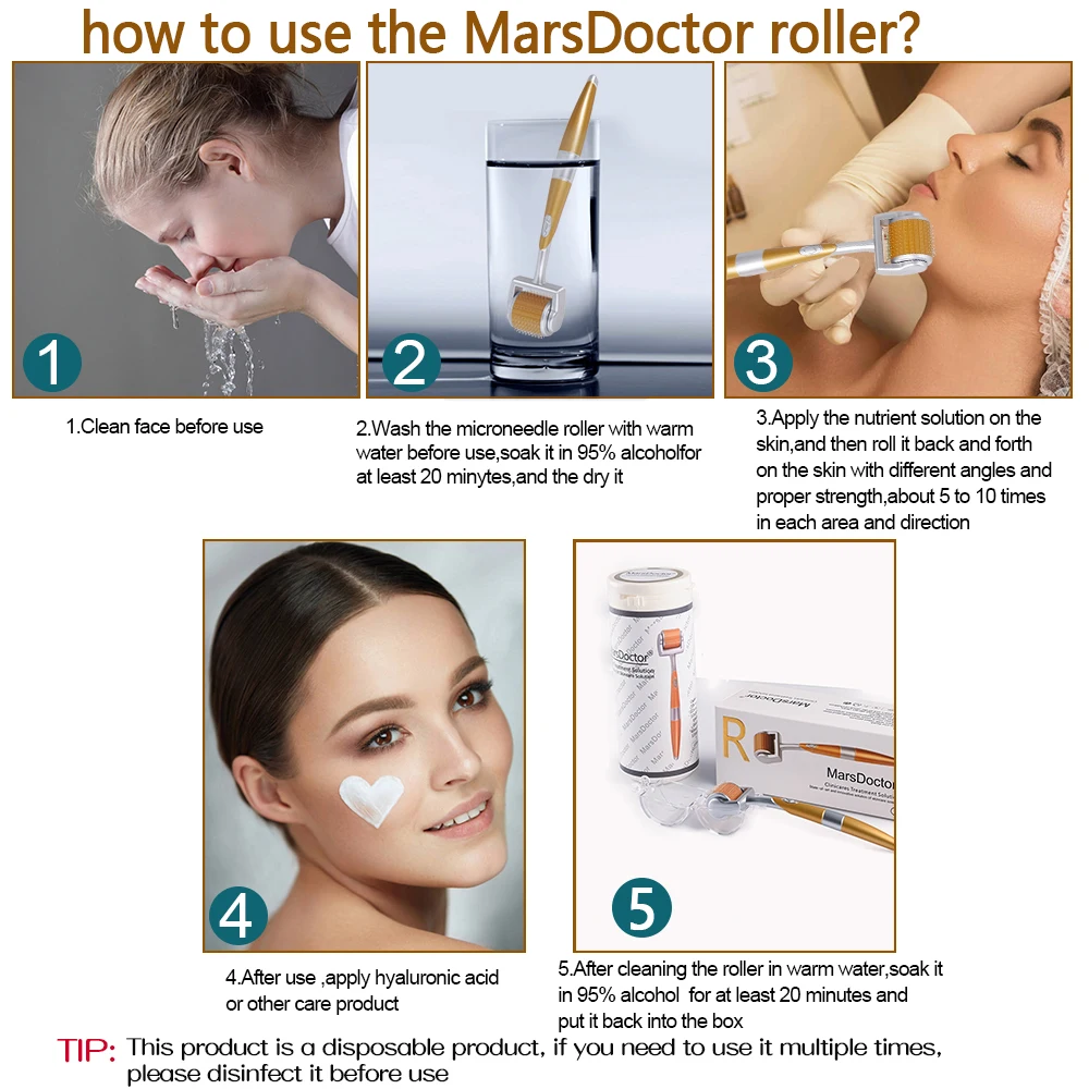 Шаг 1: перед или после использования Замочите ролик микроиглы в 75% спирта в течение не менее 15 минут, а затем в кипящую краскуШаг 2:. Очистите лицо очищающим средством для лица, а затемИспользуйте ватный диск для поглощения избыточной водыШаг 3: равномерно распределите богатый питательный растворНа кожеШаг 4: Используйте ролик, чтобы аккуратно свернутьЛицо 20 раз (с сублимациейПорошок или сыворотка)Шаг 5: нанесите средства по уходу за кожей и не мойте лицо в день использования