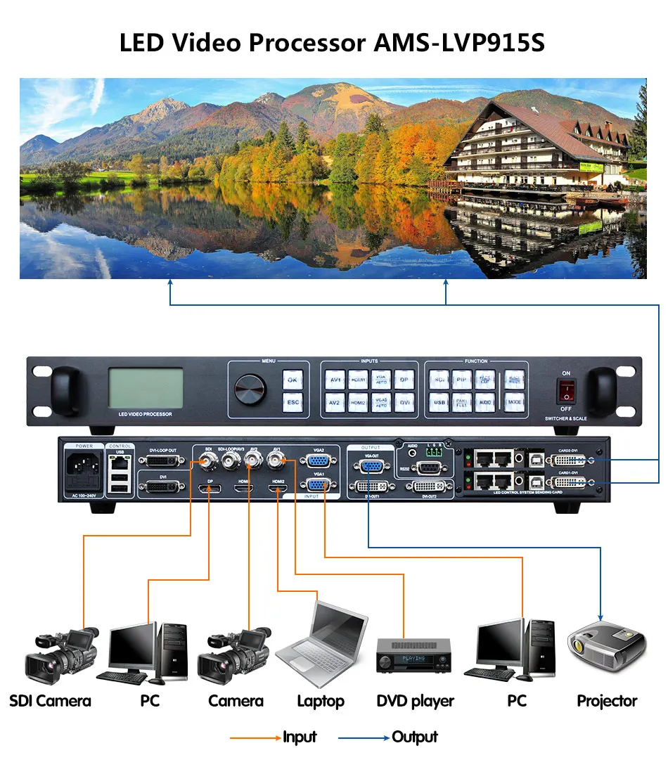 Больше канальный видеовход-светодиодный видеопроцессор 8/9-канальный видеовход, 1 DP,1 DVI, 2 HDMI, 2AV(CVBS),2 VGA, 1 3G-SDI или 1 USB (расширяющийся); В основном охватывает гражданские и промышленные Использование. Переключение всех видеовходов и быстрый вырез и переход к выцветанию. Практичные интерфейсы вывода видео-процессор имеет три выхода видео s. 2. Использование видеовыхода Два выхода DVI, включая выход VGA и выходы DVI, имеют один выходной разъем. После Эти три видео запрограммированы для отправки вывода светодиодный светодиодную карту или монитор. Видео DVI1 Распределительный выход (LOOP OUT), в multi-machine splice очень практичен, исключая использование видеораспределителя, сохраняя пользователю утомительные соединения, снижая скорость отказа соединения.