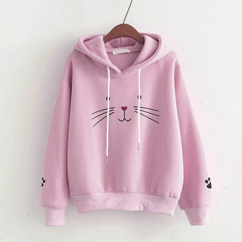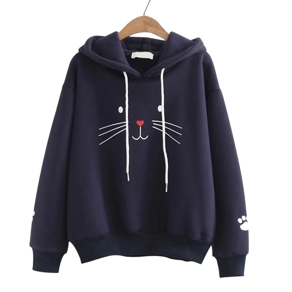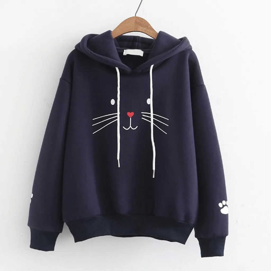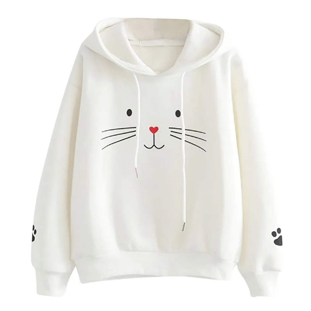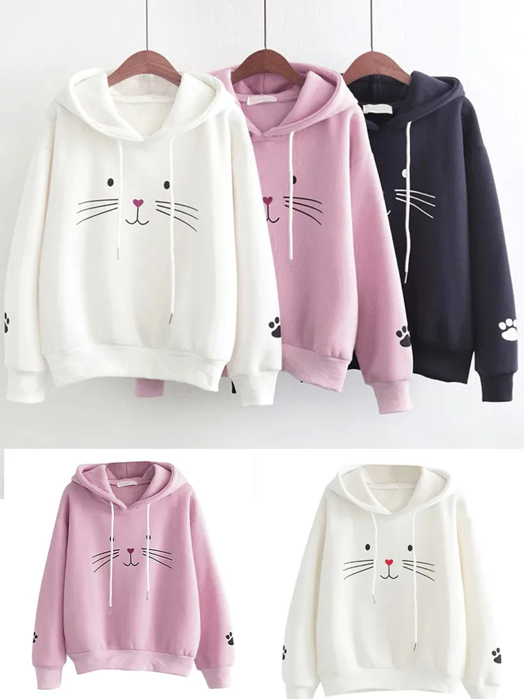 Черные толстовки с ушками в стиле Харадзюку, свитшот для женщин, топ, Женская толстовка с кошачьим принтом, толстовка, блузка