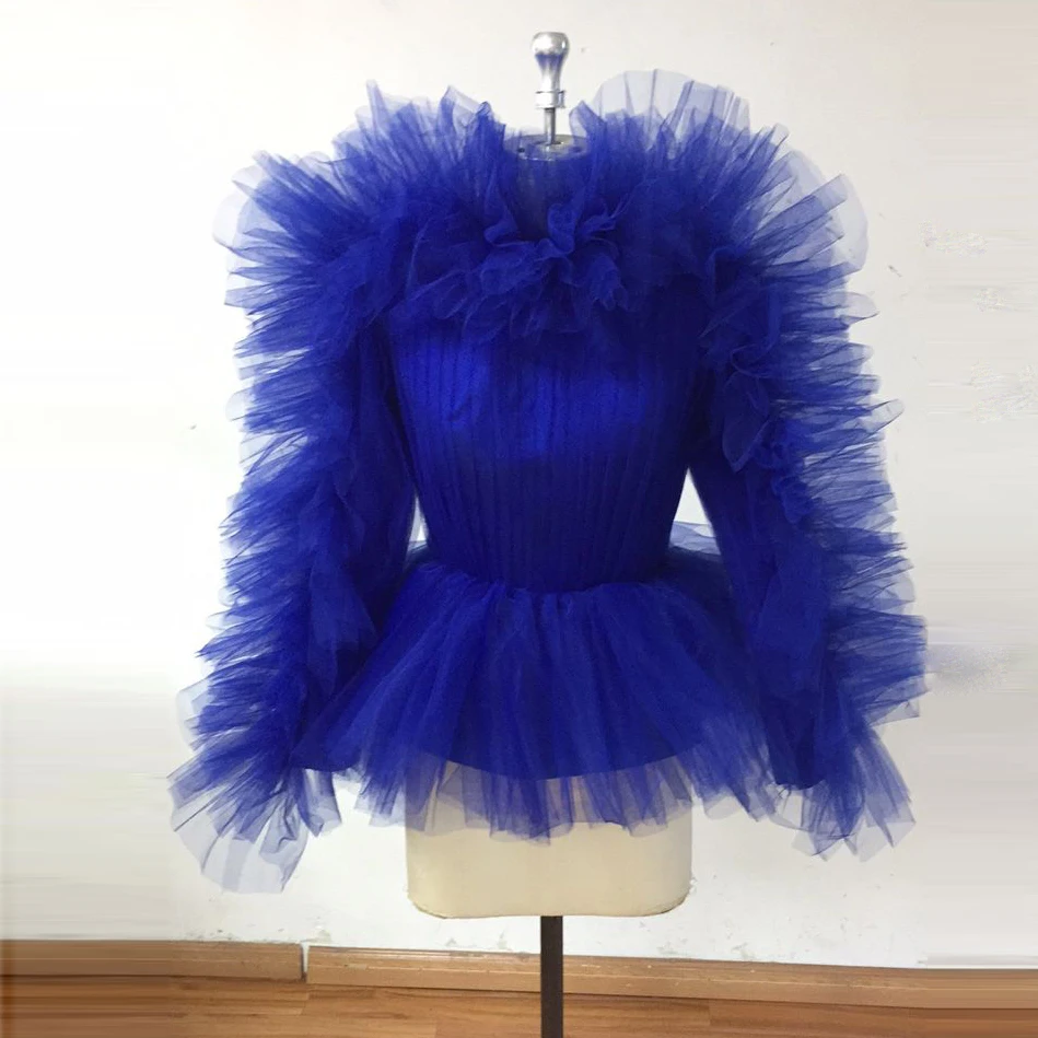 Реальное изображение Королевская Синяя Тюлевая женская блузка с оборками сетчатый женский топ модная женская блузка с длинными рукавами 2021