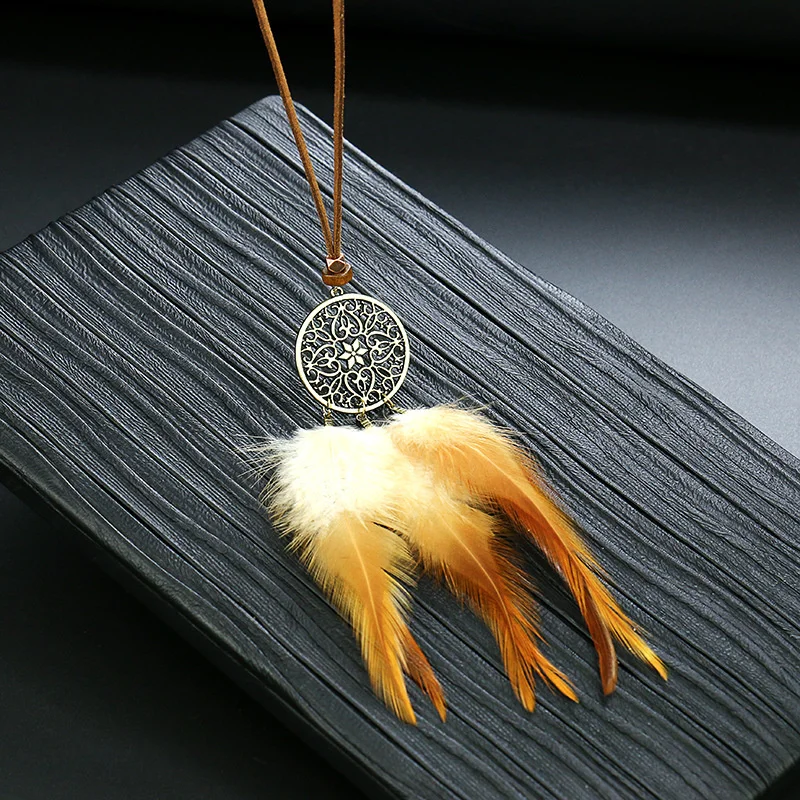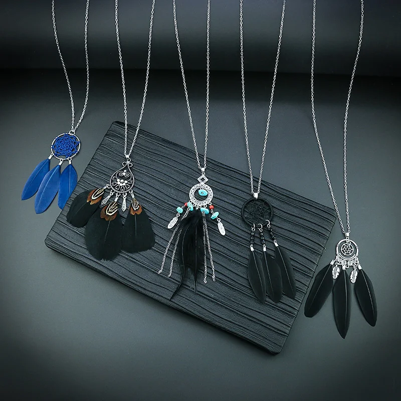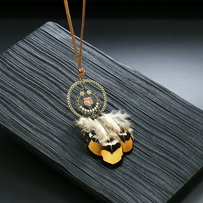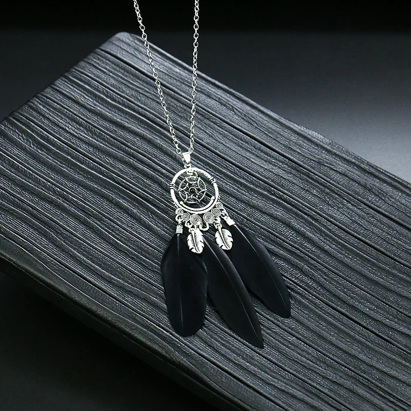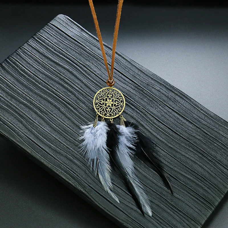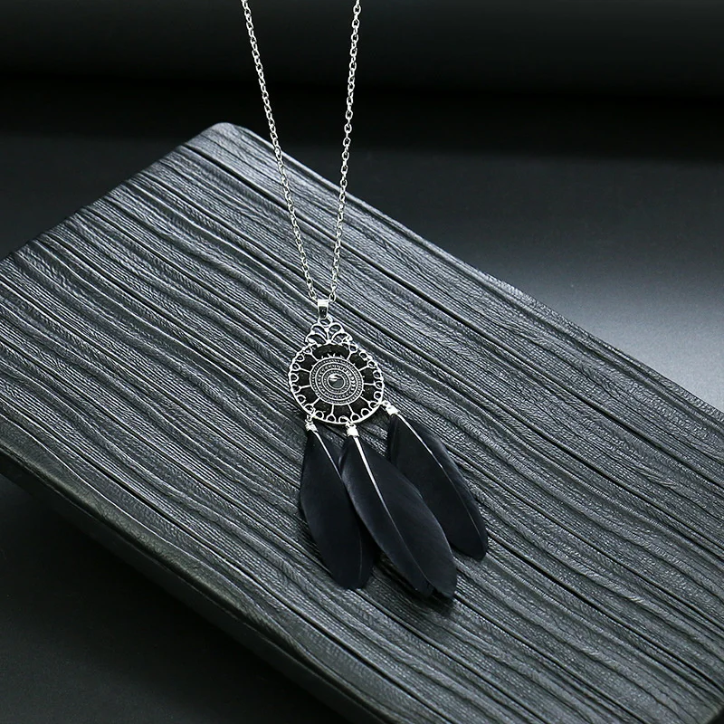 Ловец снов перо длинное ожерелье для женщин в этническом стиле Стиль ретро сплав c резными выемками снаружи и кисточкой из перьев кулон, ожерелье, ювелирные изделия