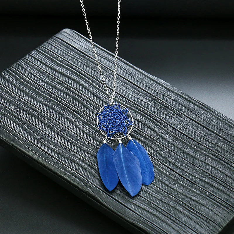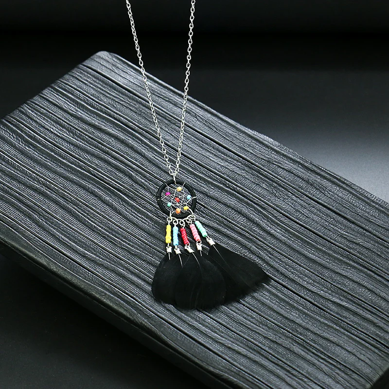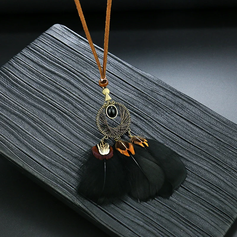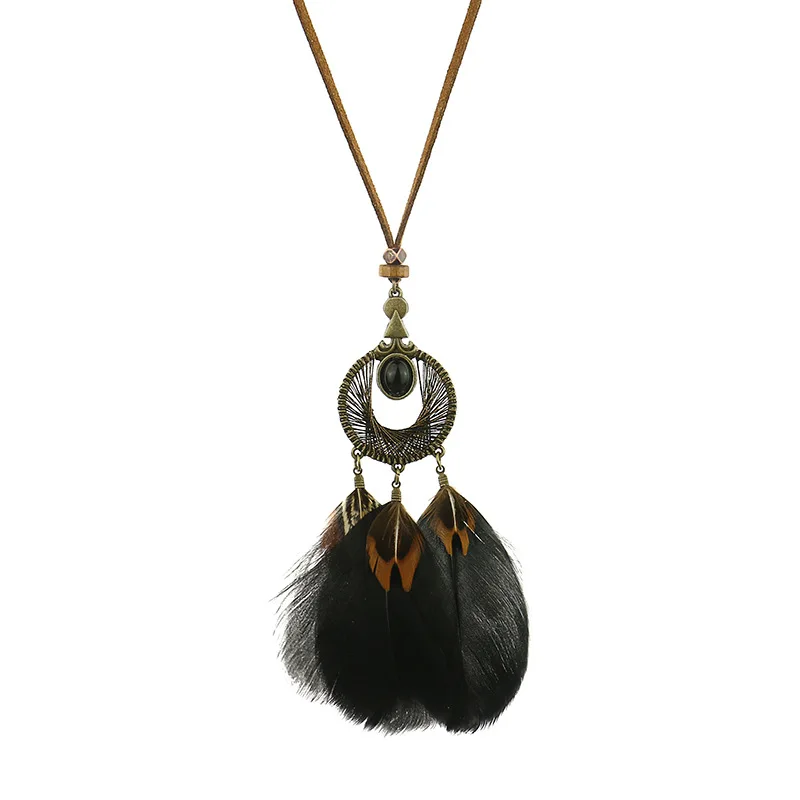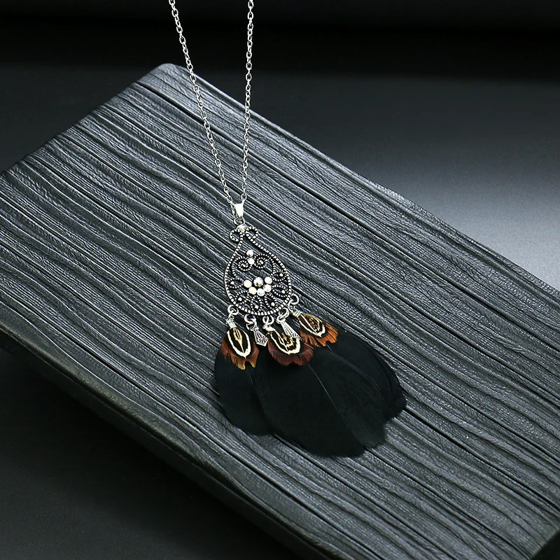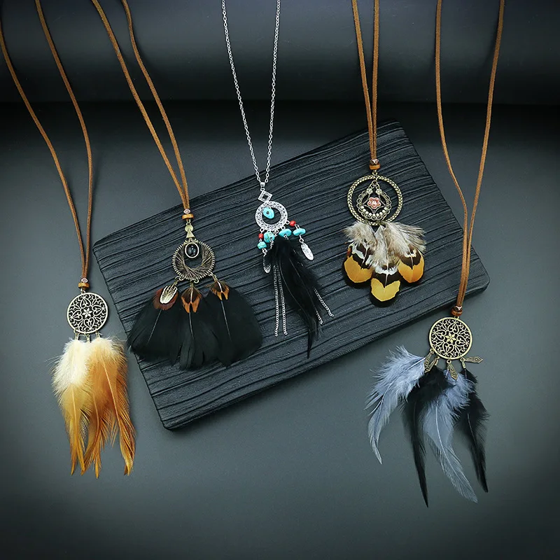 Ловец снов перо длинное ожерелье для женщин в этническом стиле Стиль ретро сплав c резными выемками снаружи и кисточкой из перьев кулон, ожерелье, ювелирные изделия