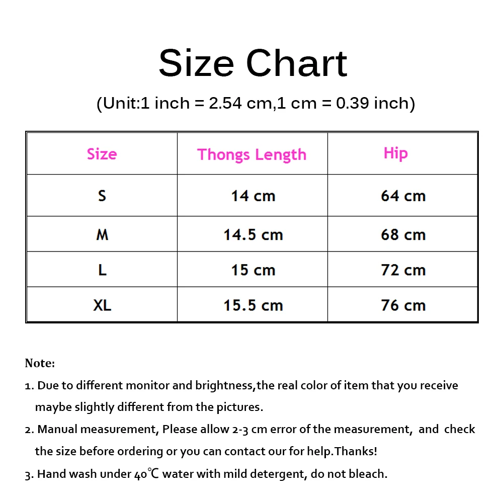 Таблица размеров:(Единица измерения: 1 дюйм = 2,54 см, 1 см = 0,39 дюйма)Размер: S, длина стрингов: 14 см, обхват бедер: 64 см.Размеры: M, стринги Длина: 14,5 см, обхват бедер: 68 см.Размер: L, длина стрингов: 15 см, обхват бедер: 72 см.Размеры: XL, стринги Длина: 15,5 см, бедра: 76 см.Посылка включает в себя:1 шт. сексуальные трусики с буквенным принтом