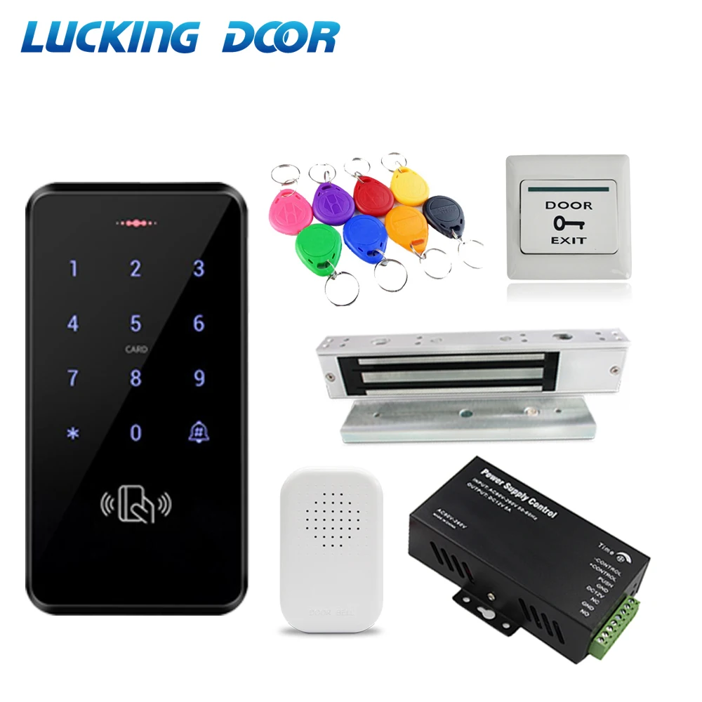 ПосылкаВ том числе: Клавиатура контроля доступа + блок питания + магнитный замок 180 кг + кронштейн U + дверной звонок + кнопка выхода + 10 брелоков