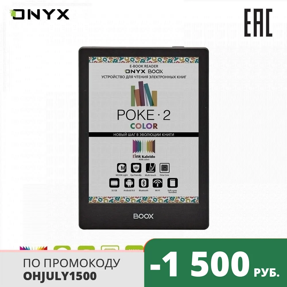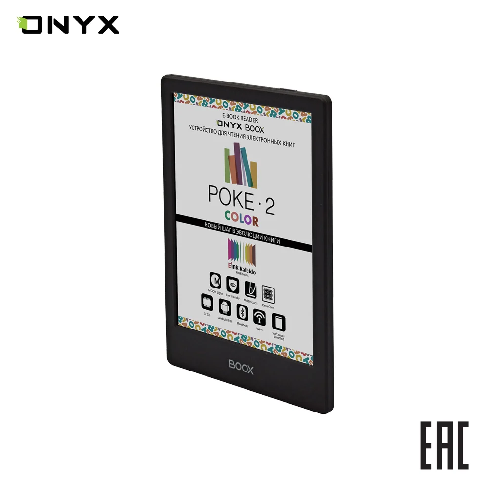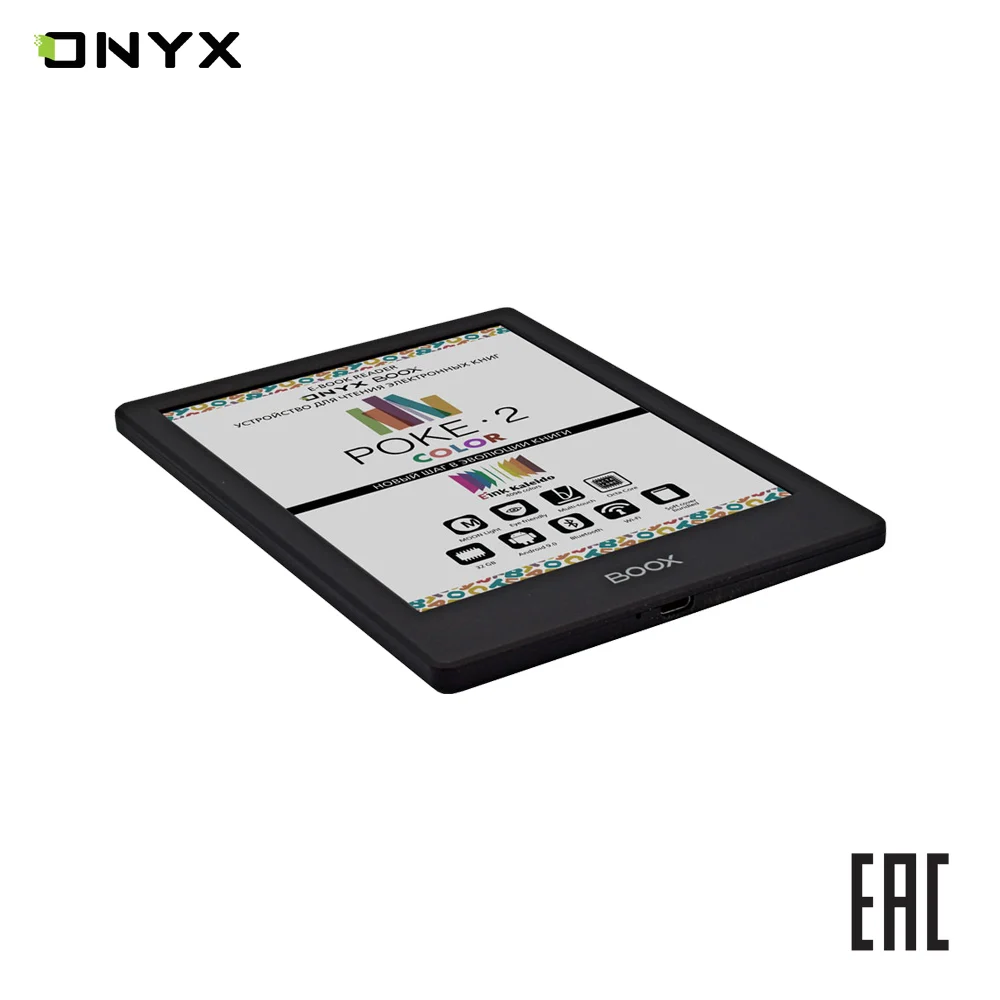 ONYX BOOX Poke 2 Color — первое в линейке производителя устройство с цветным экраном типа «электронная бумага» E Ink Kaleido. Ридер имеет компактный легкий корпус толщиной всего 6,8 мм и при этом оснащён высокопроизводительным 8-ядерном процессором, модулями Wi-Fi и Bluetooth, и управляется операционной системой Android 9.0.-Дисплей - 6", E Ink Kaleido, 4096 цветов, 1072 × 1448 точек, плотность пикселей - 300 ppi (100 ppi в цветном режиме)-Сенсорный экран - Ёмкостный с функцией Multi-touch и SNOW Field-Подсветка - MOON Light -Процессор - 8-ядерный, 2 ГГц-Оперативная память - 2 ГБ-Встроенная память - 32 ГБ-Проводной интерфейс - USB Type-C с поддержкой OTG-Поддерживаемые форматы файлов - TXT, HTML, RTF, FB2, FB2.zip, FB3, MOBI, CHM, PDB, DOC, DOCX, PRC, EPUB, CBR, CBZ, PDF, DjVu, JPG, PNG, GIF, BMP-Беспроводной интерфейс - Wi-Fi IEEE 802.11 b/g/n/ac-Bluetooth - 4.1-Аккумулятор - Литиево-полимерный, ёмкость 1500 мАч-Операционная система - Android 9.0-Материал корпуса - Пластик-Размеры - 153 × 107 × 6,8 мм мм-Цвет - Чёрный-Вес - 150 г-Гарантийный срок - 1 годКомплектация:-Электронная книга ONYX BOOX Poke 2 Color-Чехол -Руководство пользователя-USB-кабель-Гарантийный талон