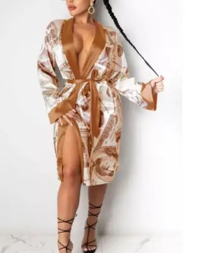Для женщин Атласный халат Мода с принтом доллара с длинным рукавом ...