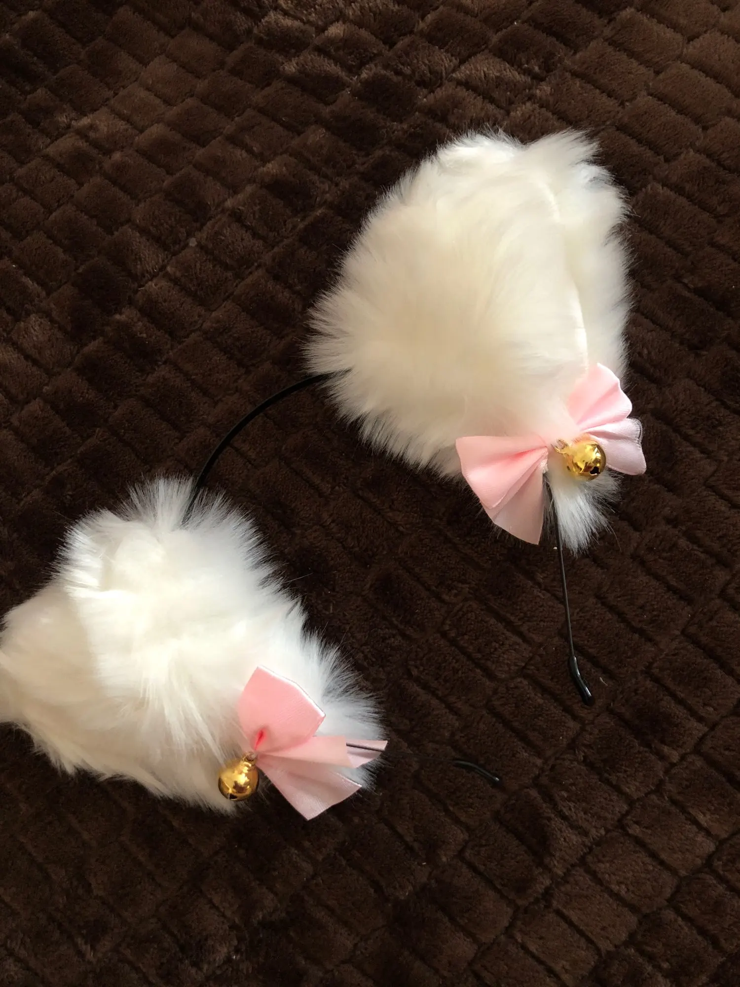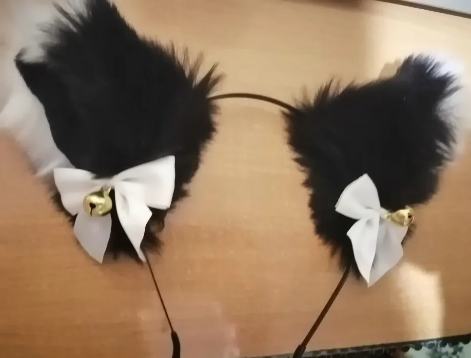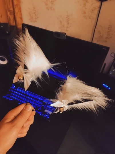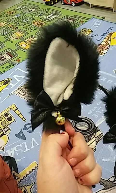 Ушки большие, на вид мне очень нравятся. Пока я их расчёсывала, чтобы выровнять шерсть, выпали несколько волосков, и больше ничего не выпадает, даже когда случайно прижимаешь и тянешь. Двигаются на обруче с небольшим трудом, но это, с другой стороны, хорошо, потому что не будут сами случайно опускаться и подниматься. Звенят при малейшем движении головы, но это можно исправить, заклеив отверстия в бубенчиках. Это будет достаточно сложно из-за маленькой ширины отверстий, но тем не менее, возможно при большом желании