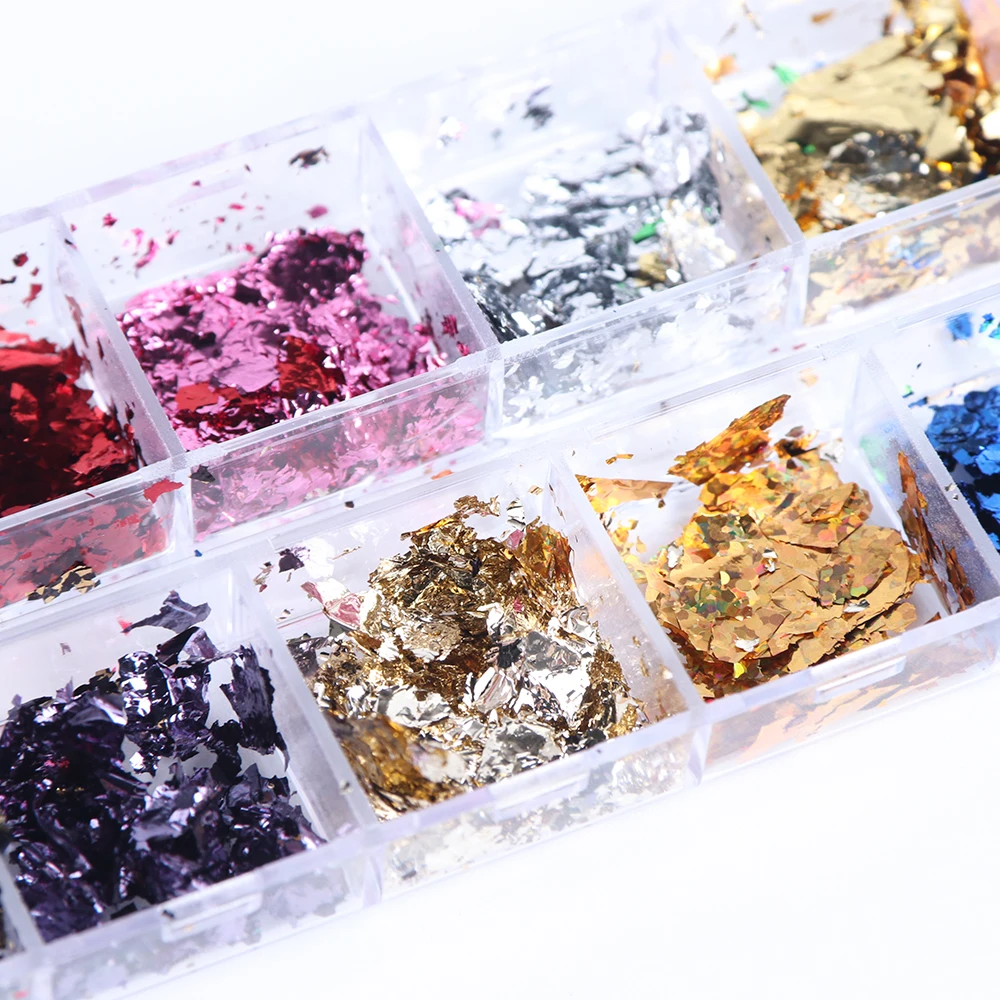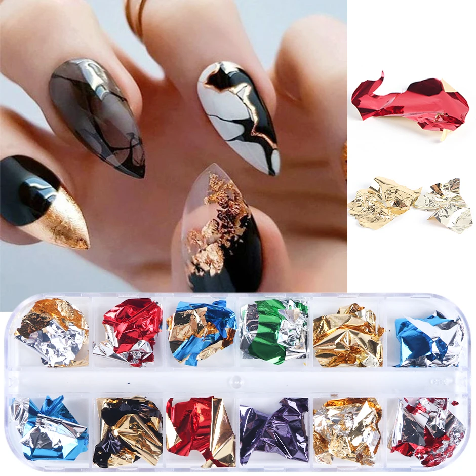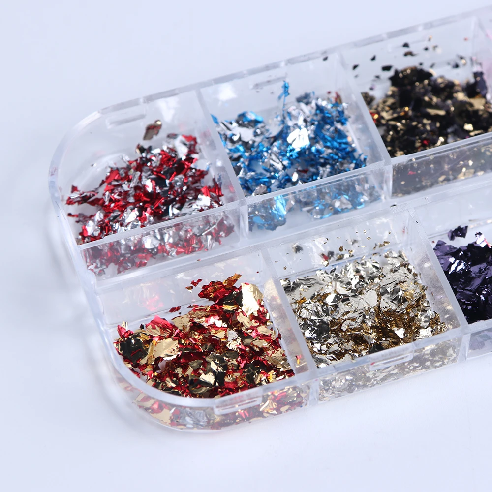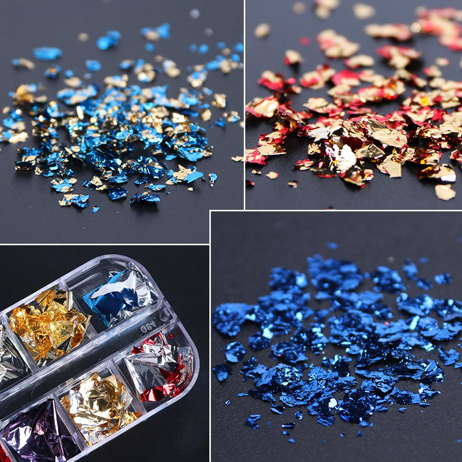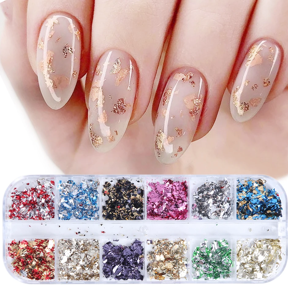 Золотая фольга, 12 сеток, блестящие хлопья для ногтей, блестящие алюминиевые Блестки для дизайна ногтей, аксессуары для украшения ногтей GL950