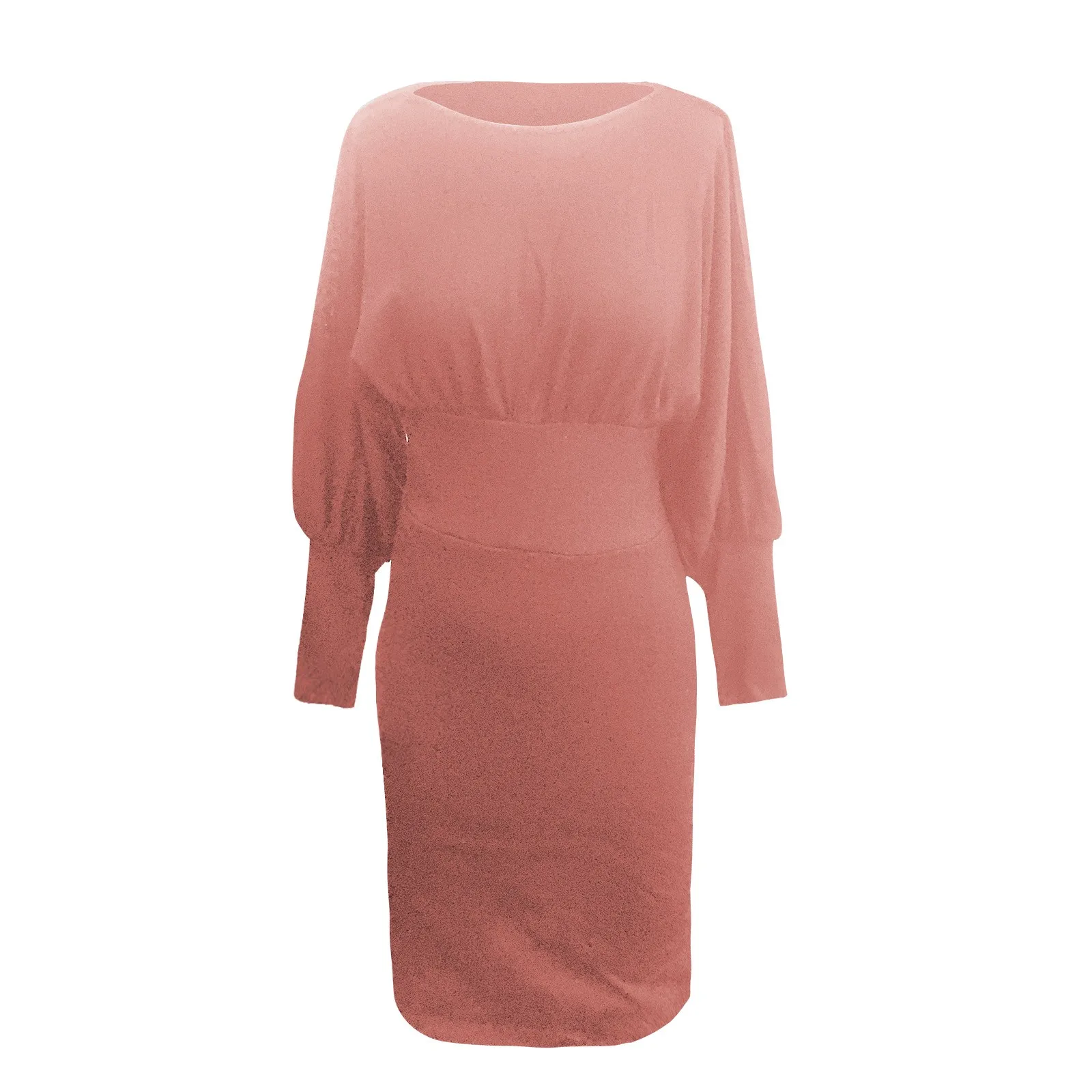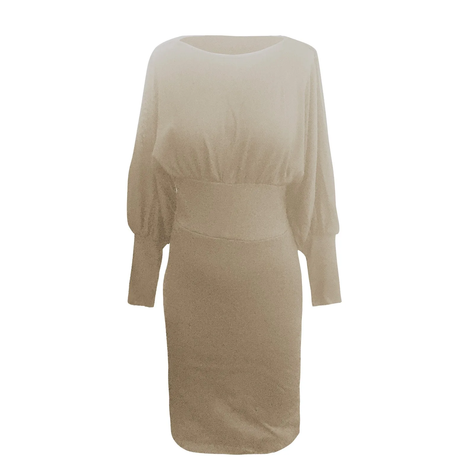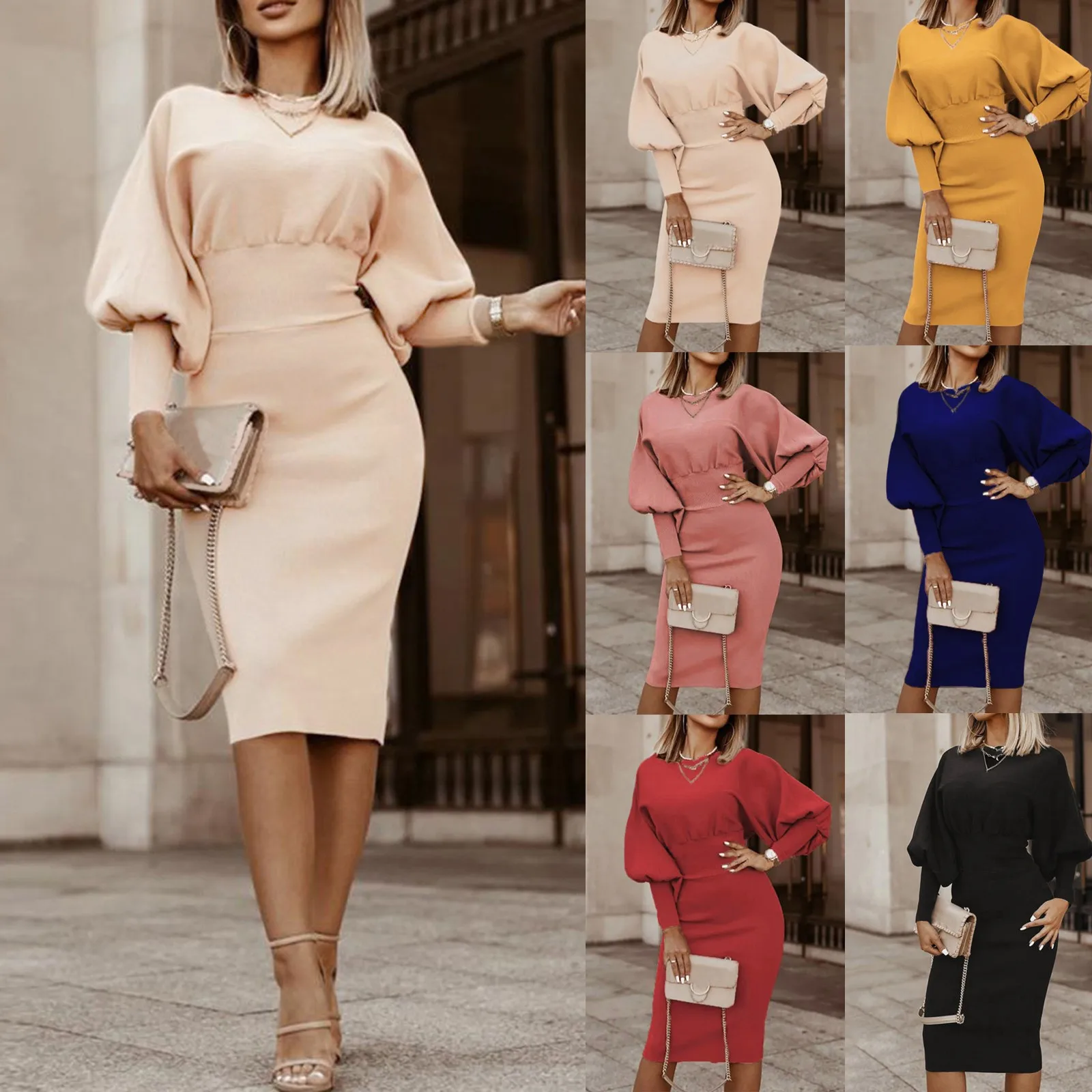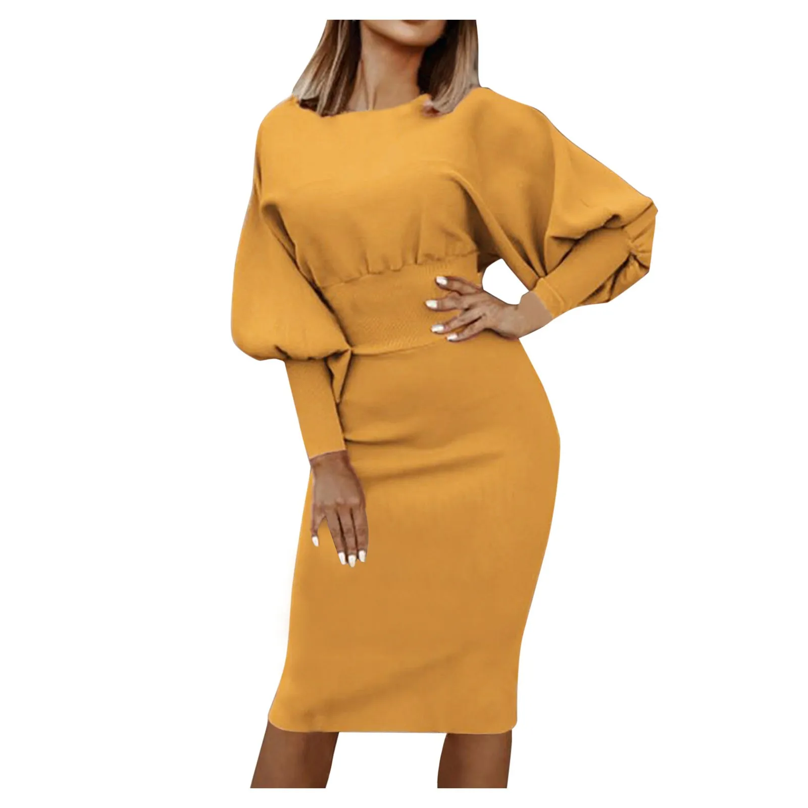 Платье-миди женское с длинным рукавом-фонариком, элегантное модное однотонное простое универсальное облегающее повседневное уличное платье с круглым вырезом